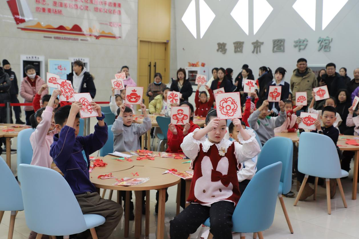 同一時間,雞西市圖書館舉辦『相約圖書館非遺鬧元宵』主題活動,活動設有猜燈謎、花燈DIY、剪紙等多個環節。活動中,小朋友們在志願者的幫助下,制作出漂亮花燈。剪紙環節,小朋友們剪出吉祥圖案,不少小朋友還剪出了亞冬會比賽項目圖案,表達對亞冬會的美好祝福。猜燈謎環節,主持人與場內外群眾積極互動,70個燈謎涵蓋歷史、民俗、文學等內容,此外大家還踴躍背誦、接續有關元宵節或月亮的詩句,參與者熱情高漲,氛圍熱烈。