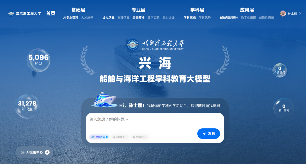 『興海』教育專有大模型以DeepSeek、文心一言、Kimi三大模型作為支橕。大模型由哈工程與中國船舶科學研究中心、上海船舶研究設計院、上海外高橋造船有限公司等共建,共享實船試驗、虛擬仿真試驗數據,涵蓋30000多個行業知識點,近5000型船舶試驗數據,4000餘條行業崗位分析數據,20門以上國家級、省級一流專業核心課,50多部船海專業教材等船舶行業海量的數據資源,貫穿基礎層、專業層、學科層、應用層四個層級。大模型面向學生、教師及社會用戶,將船海行業知識與人工智能深度融合,拓展了從學到研的學習空間,促進了從教到創的轉型昇級,建立了涵蓋AI專業課程學習、虛擬仿真實踐、物理仿真預報、船舶性能智能預測、船舶智能設計、學科崗位分析等功能的一站式教育平臺,打通了學校育人與企業需求的壁壘,為培養未來船海領域領軍人纔提供重要支橕。