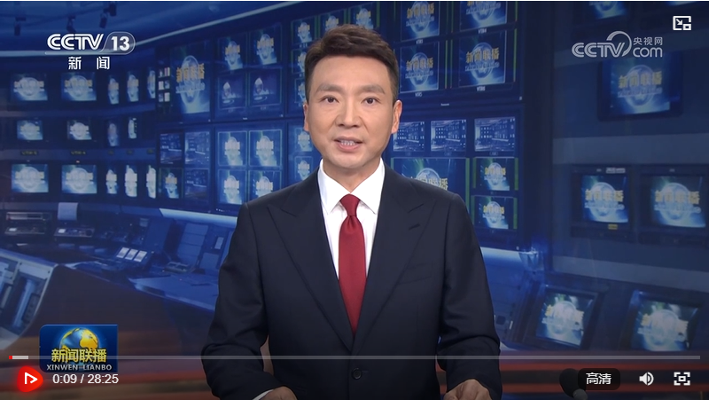 電子屏幕上出現鍾擺的畫面。隨著鍾擺,1945、1955、1965……2025的年份數字依次顯現。9時整,報時鍾聲響起,紀念大會開始。