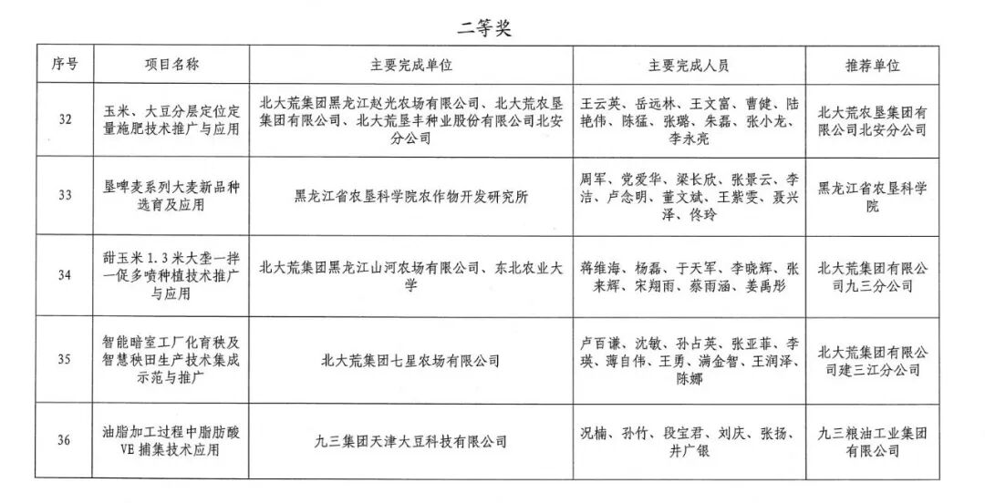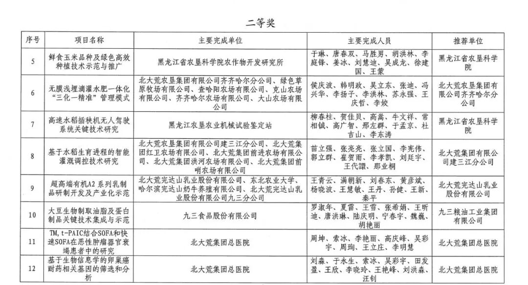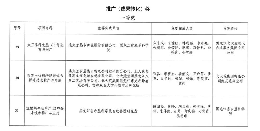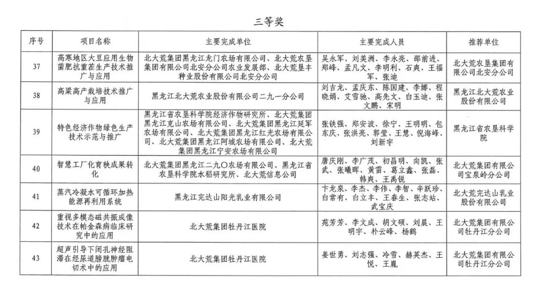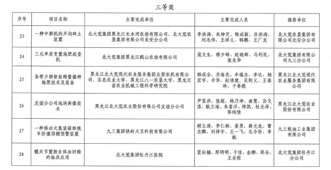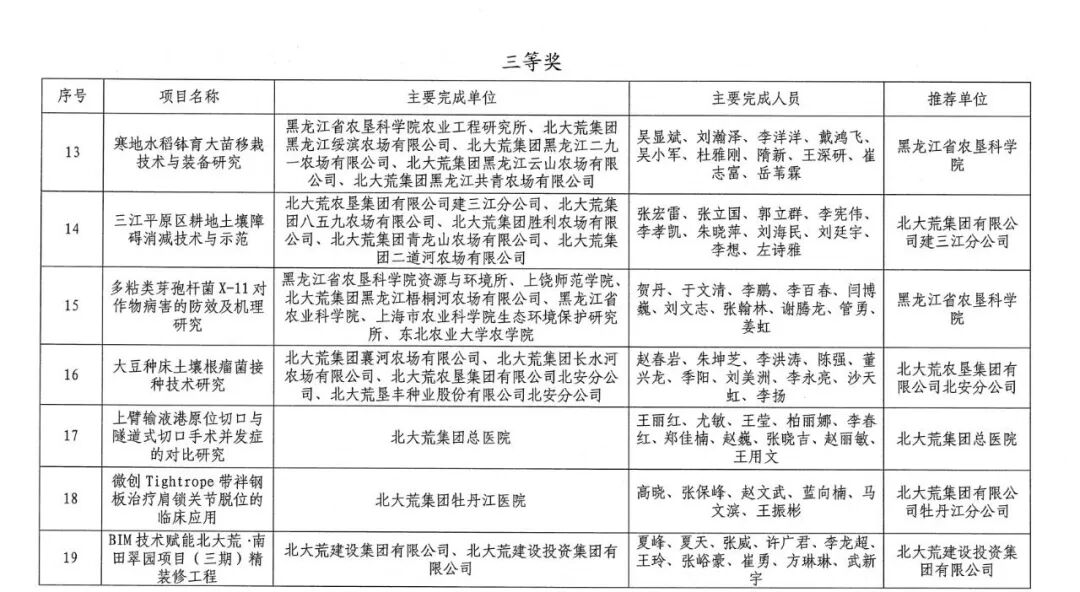 三等獎中,『大豆種床土壤根瘤菌接種技術研究』等7項成果獲得集團科技進步獎三等獎,『三元單質變量施肥起壟機』等6項成果獲得集團科技發明獎三等獎,『重視多模態磁共振成像技術在帕金森病臨床研究中的應用』等7項成果獲得集團推廣(成果轉化)獎三等獎。