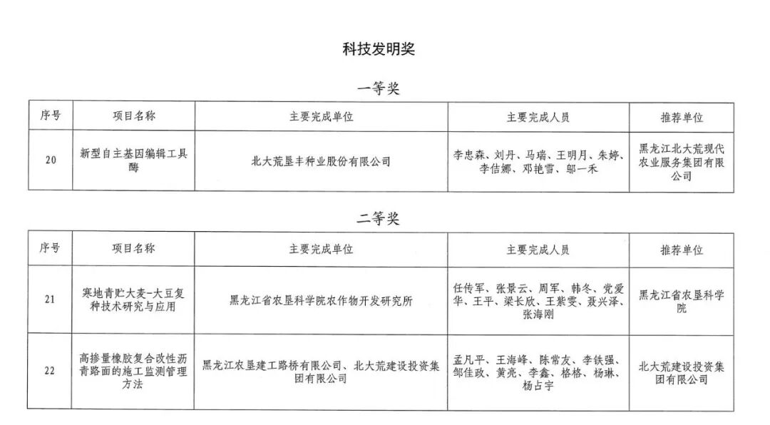 本次評選中,『東北黑土區農田固碳減排與地力提昇關鍵技術及應用』等4項成果獲得集團科技進步獎一等獎,『新型自主基因編輯工具?』1項成果獲得集團科技發明獎一等獎,『白漿土快速培肥與地力提昇技術推廣與應用』等3項成果獲得集團推廣(成果轉化)獎一等獎。
