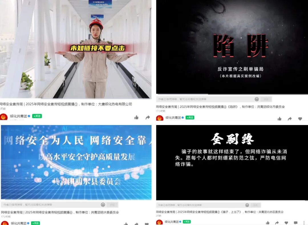 同時,在宣傳周活動期間,圍繞『網絡安全為人民網絡安全靠人民』主題,面向全域團員青年征集宣傳網絡安全法律法規、普及網絡安全知識和技能、警示網絡安全風險、爭做中國好網民、積極弘揚網絡正能量的微視頻作品,通過『綏化共青團』官方公眾賬號等新媒體平臺展播優秀作品8個,瀏覽量達1.3萬次。
