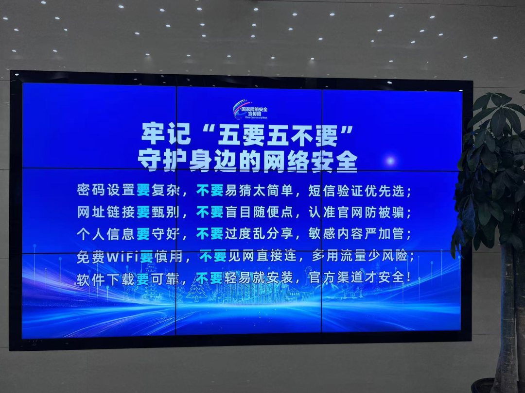 滾動播放視聽材料。充分利用網點內的電子顯示屏、電視等設備,循環播放網絡安全短視頻、動漫,通過真實案例剖析、情景模擬等方式,動態展示網絡安全風險與防范措施,增強了宣傳的吸引力和感染力。
