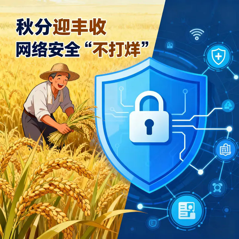 秋分至,稻浪翻滾、瓜果飄香,人間處處是豐收的喜悅。當我們忙著盤點生活裡的『碩果』時,網絡世界的『安全防線』卻容不得半分松懈——不法分子不會因季節更迭停下腳步,信息泄露風險也不會隨秋風消散。在這個收獲與守護並行的時節,網絡安全必須『全年無休、時刻在線』,纔能守住我們的數字財產與個人隱私,讓豐收的喜悅不被風險打擾。