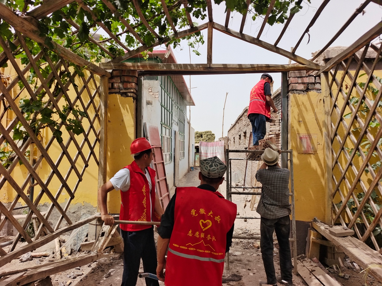 圖:阿克陶縣玉麥鎮霍伊拉艾日克村駐村工作隊隊員幫助村民維修房門