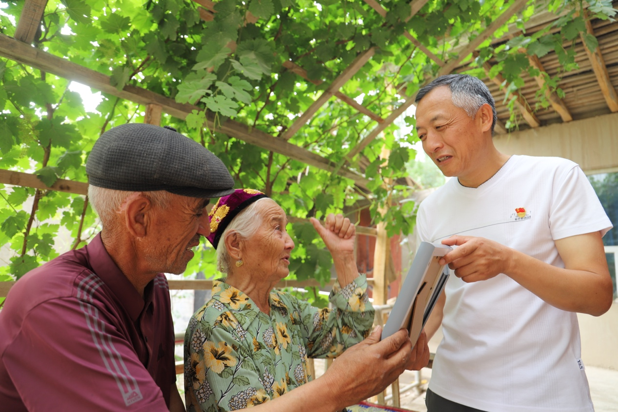 圖:疏勒縣英阿瓦提鄉安居爾村駐村工作隊隊員為村民送上母親節紀念照