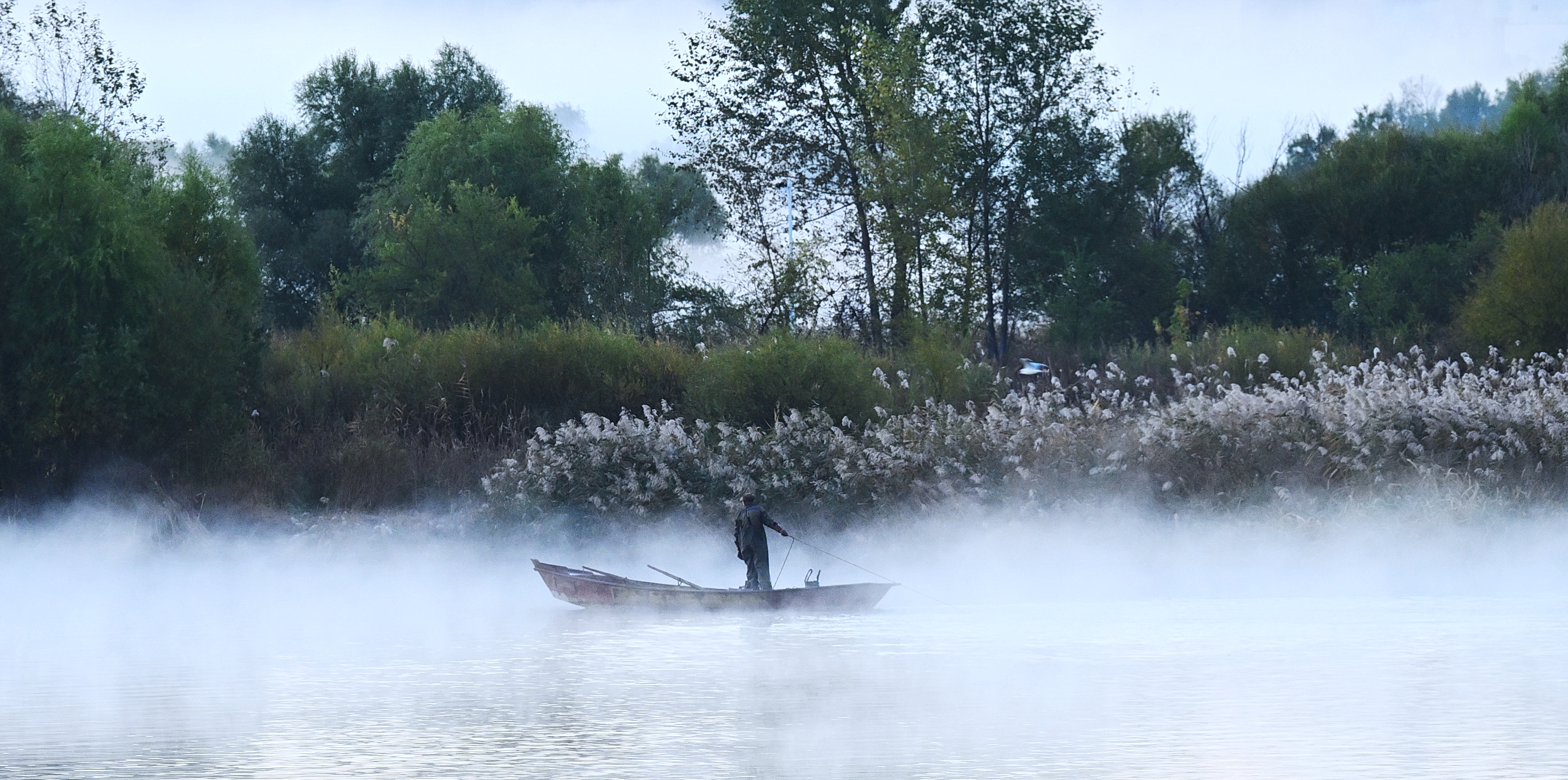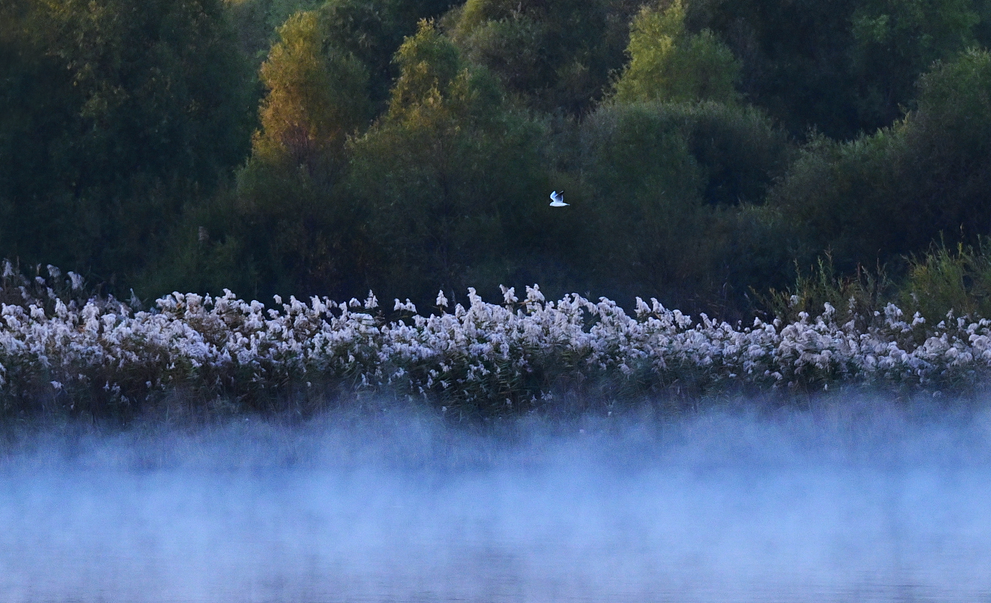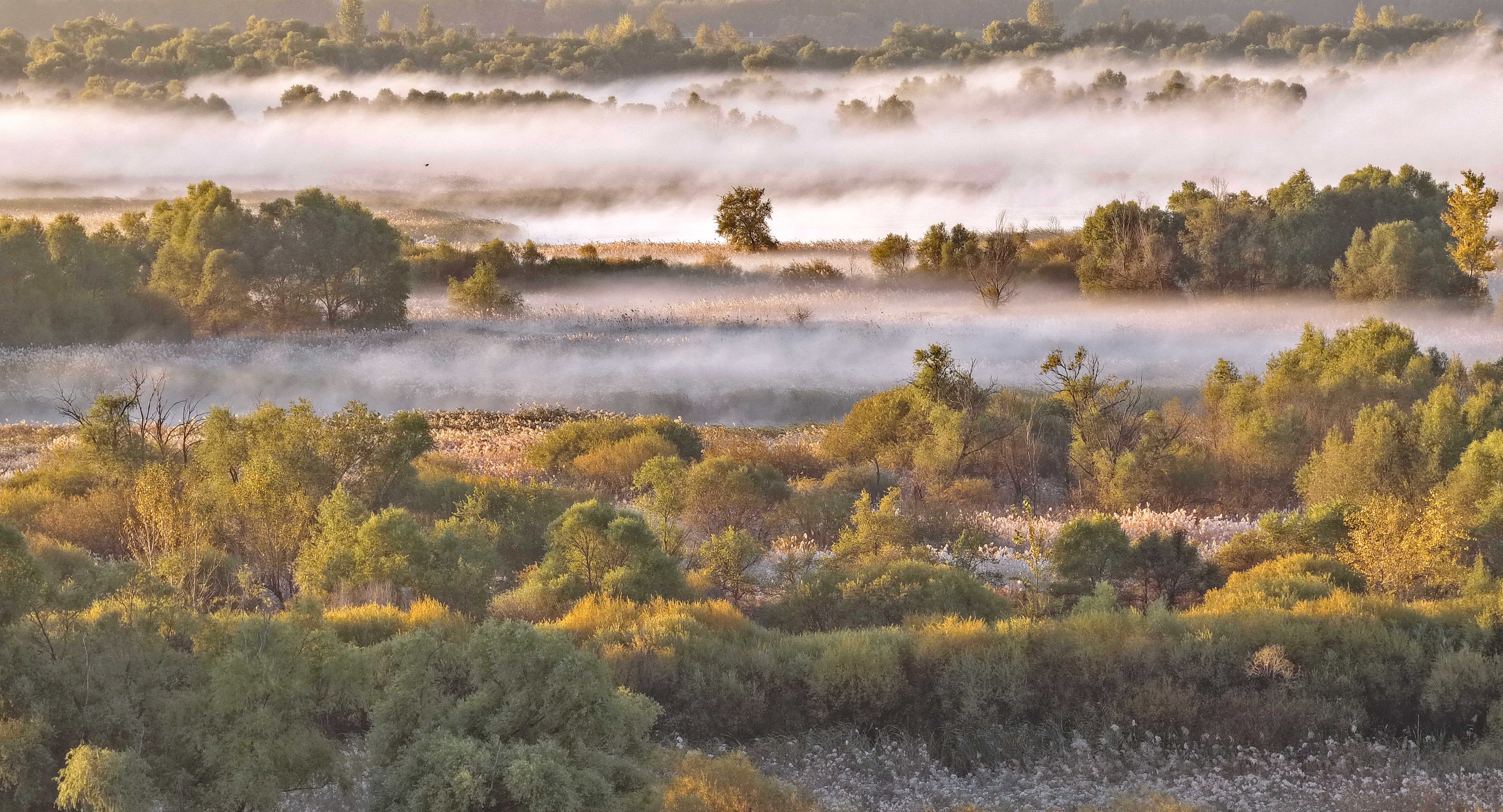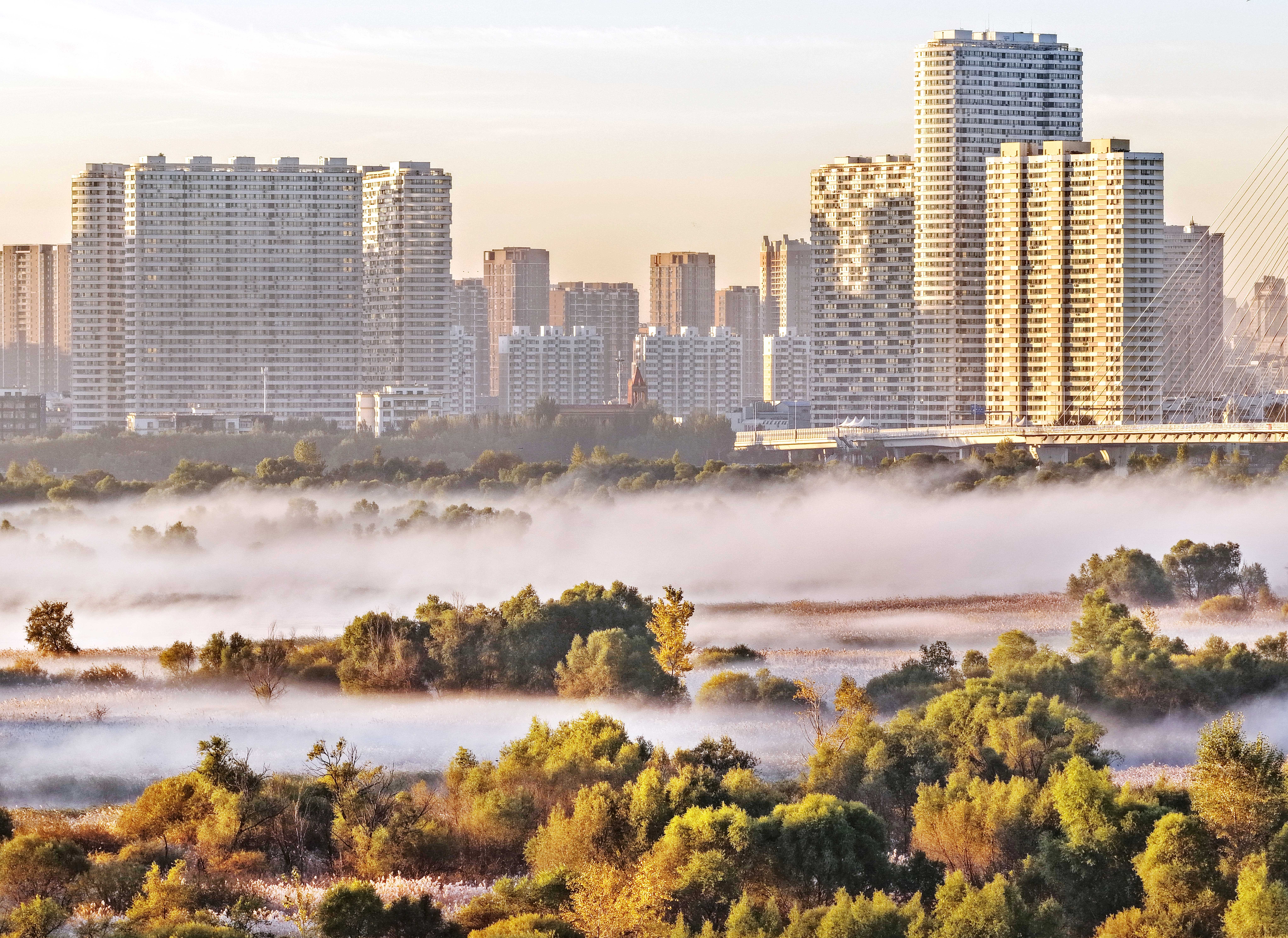 晨光中,淡粉色的霧氣緩緩地流動,為城郊斑斕的秋色披上了一層輕紗。水鳥翩然飛過,遠處城市的樓宇和街路若隱若現,宛如一幅靈動夢幻的水彩畫。