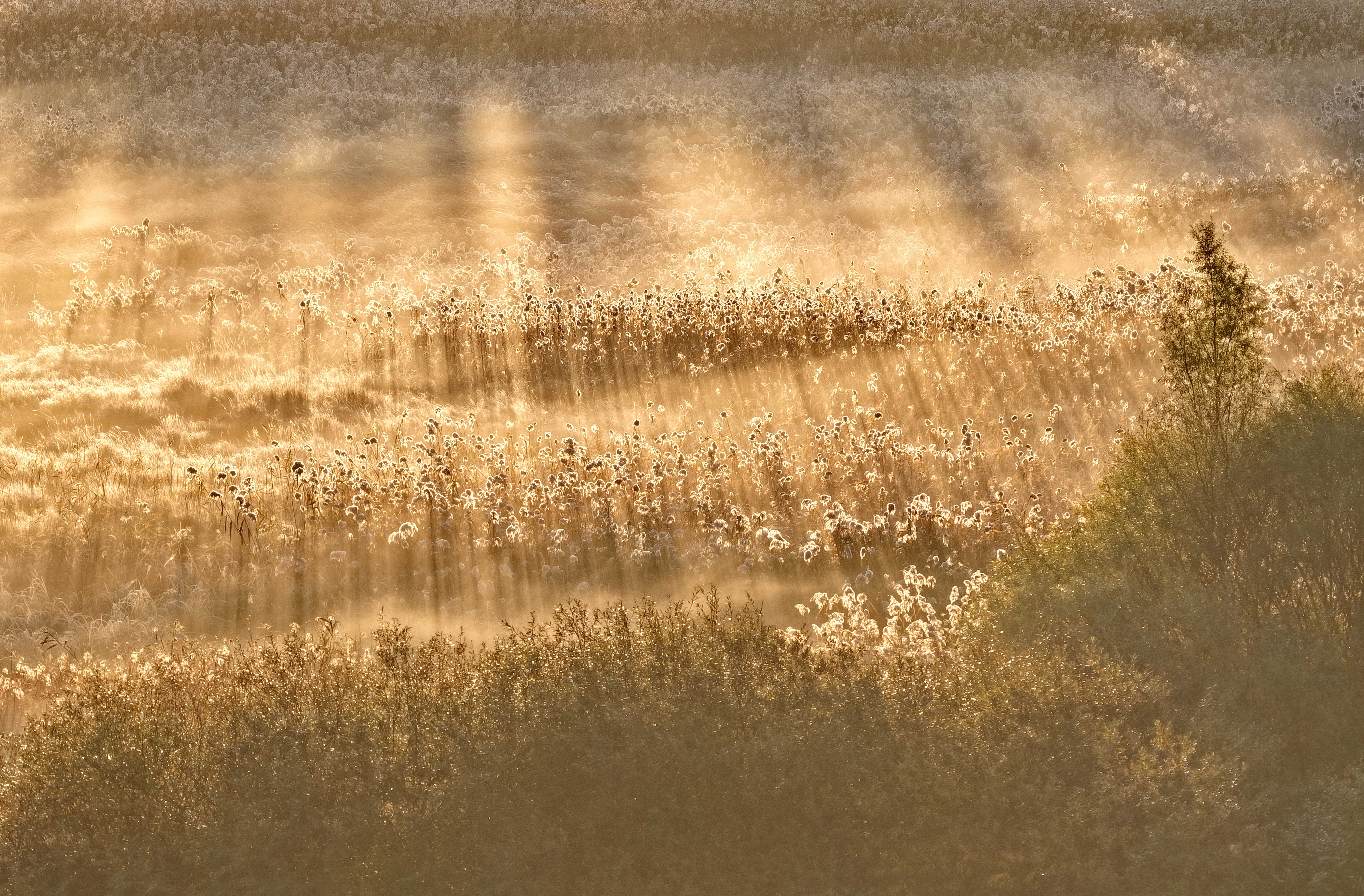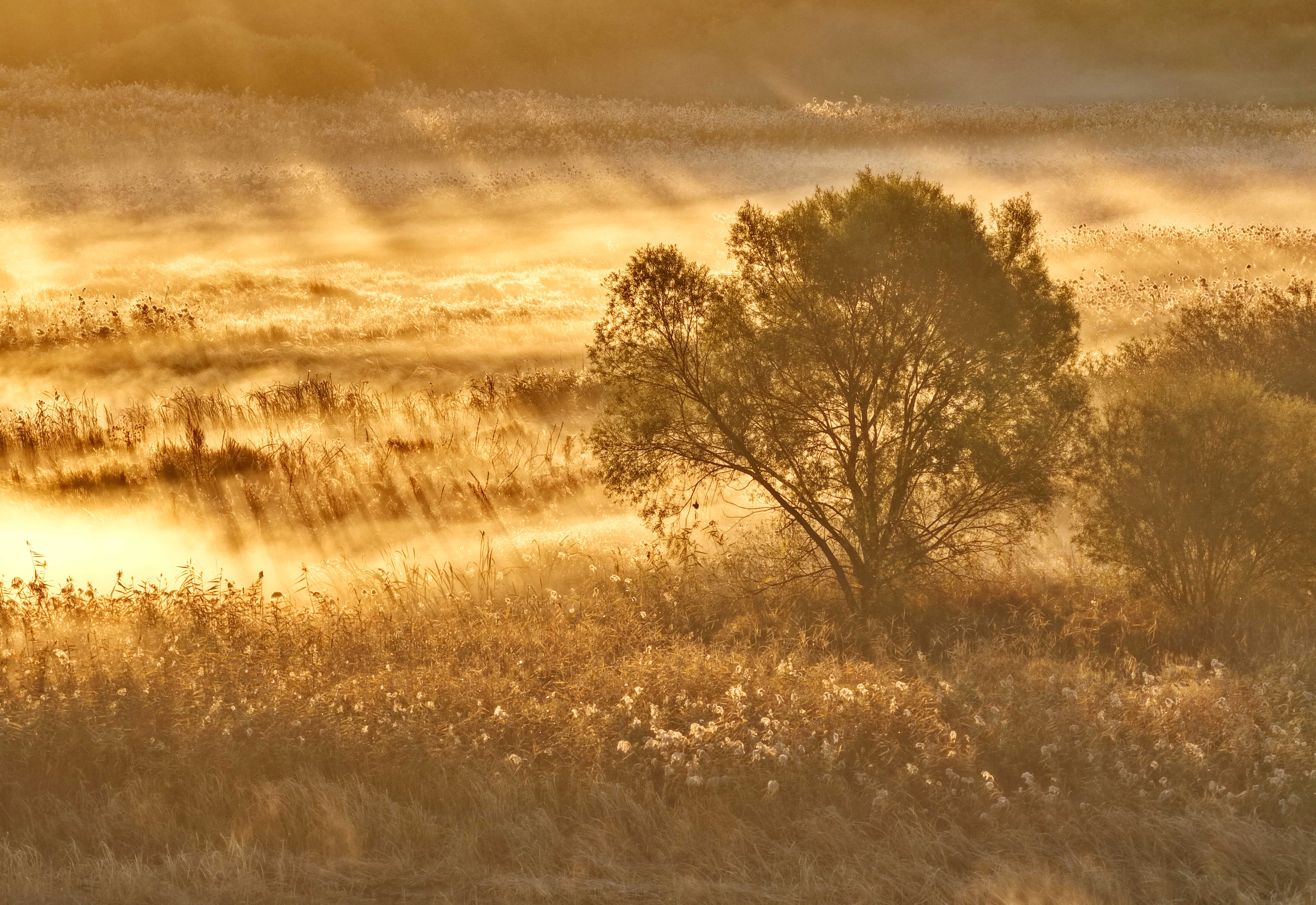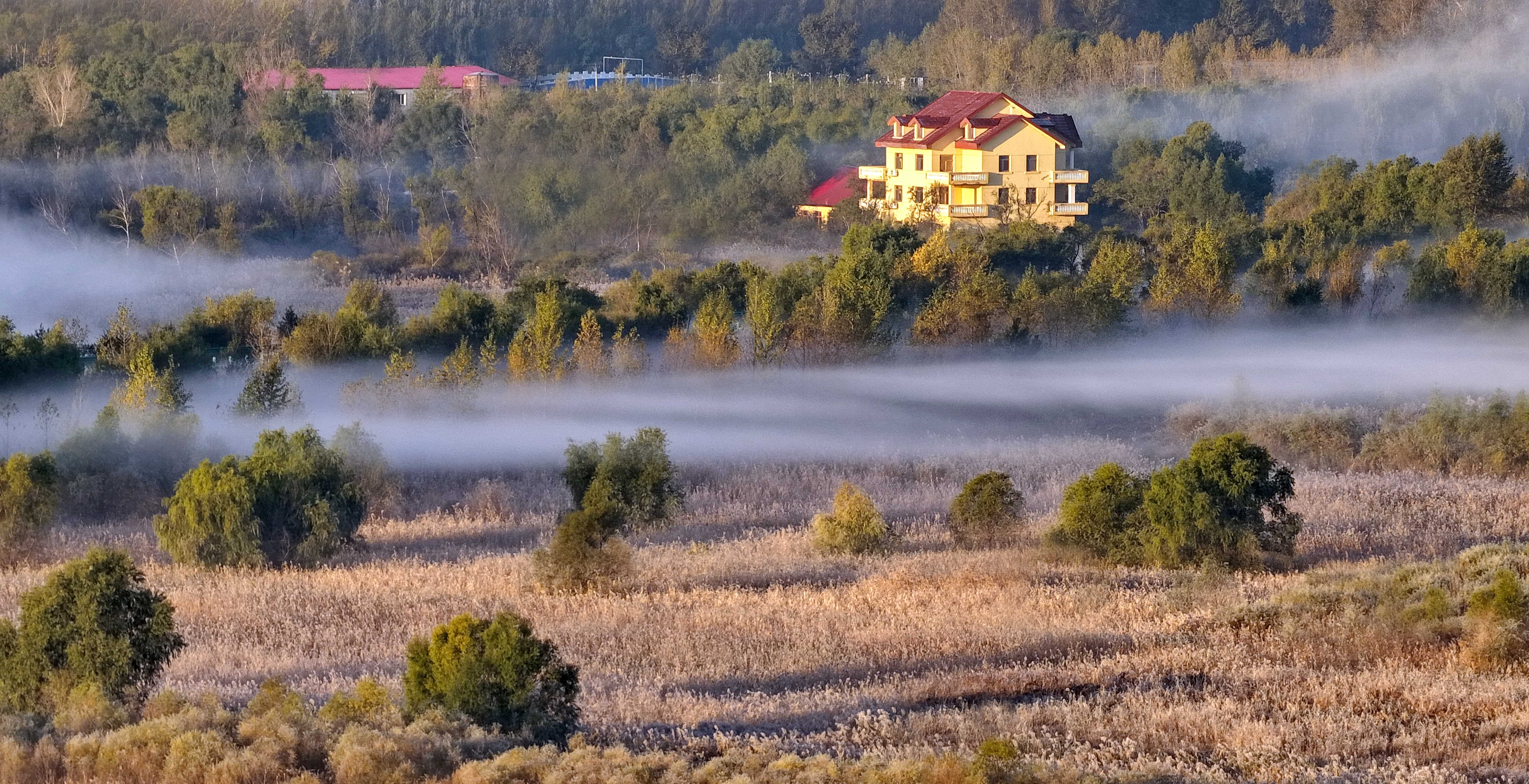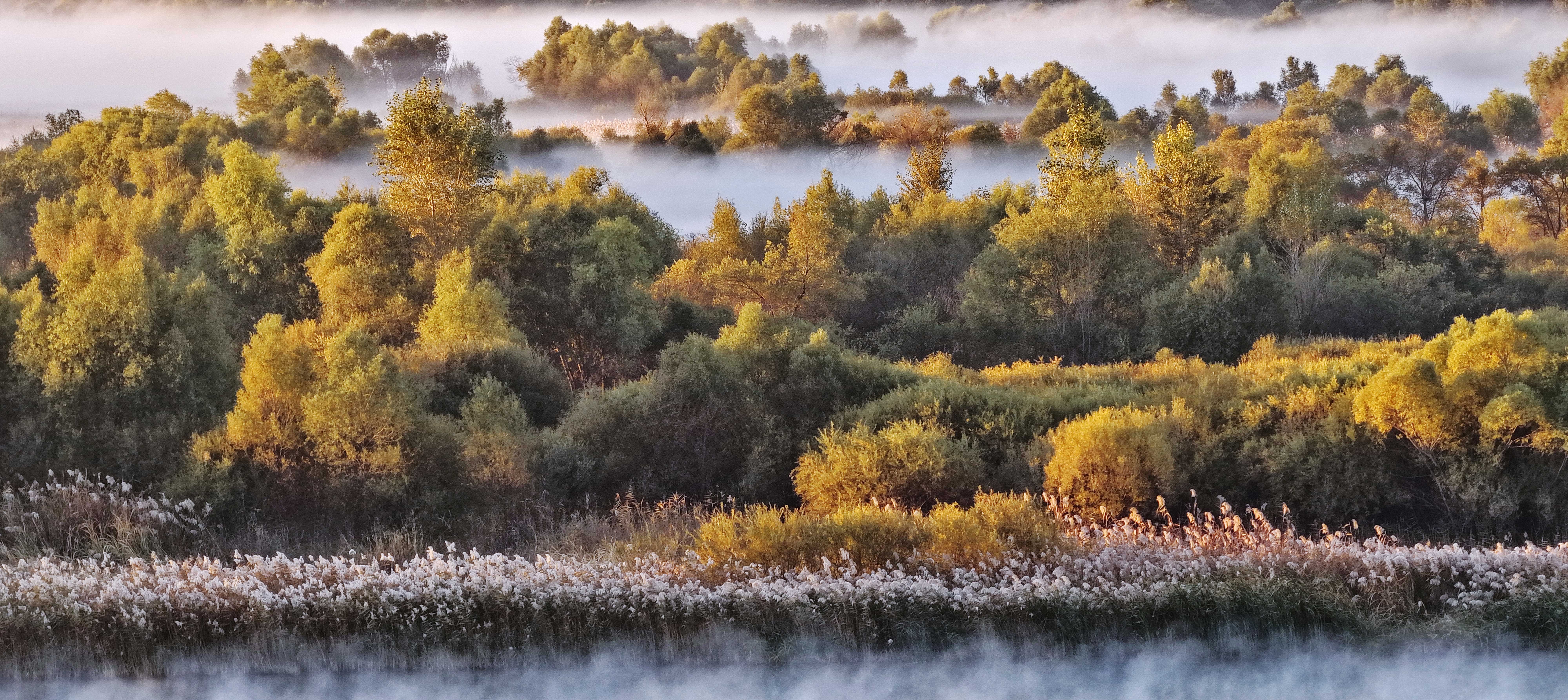 晨光中,淡粉色的霧氣緩緩地流動,為城郊斑斕的秋色披上了一層輕紗。水鳥翩然飛過,遠處城市的樓宇和街路若隱若現,宛如一幅靈動夢幻的水彩畫。