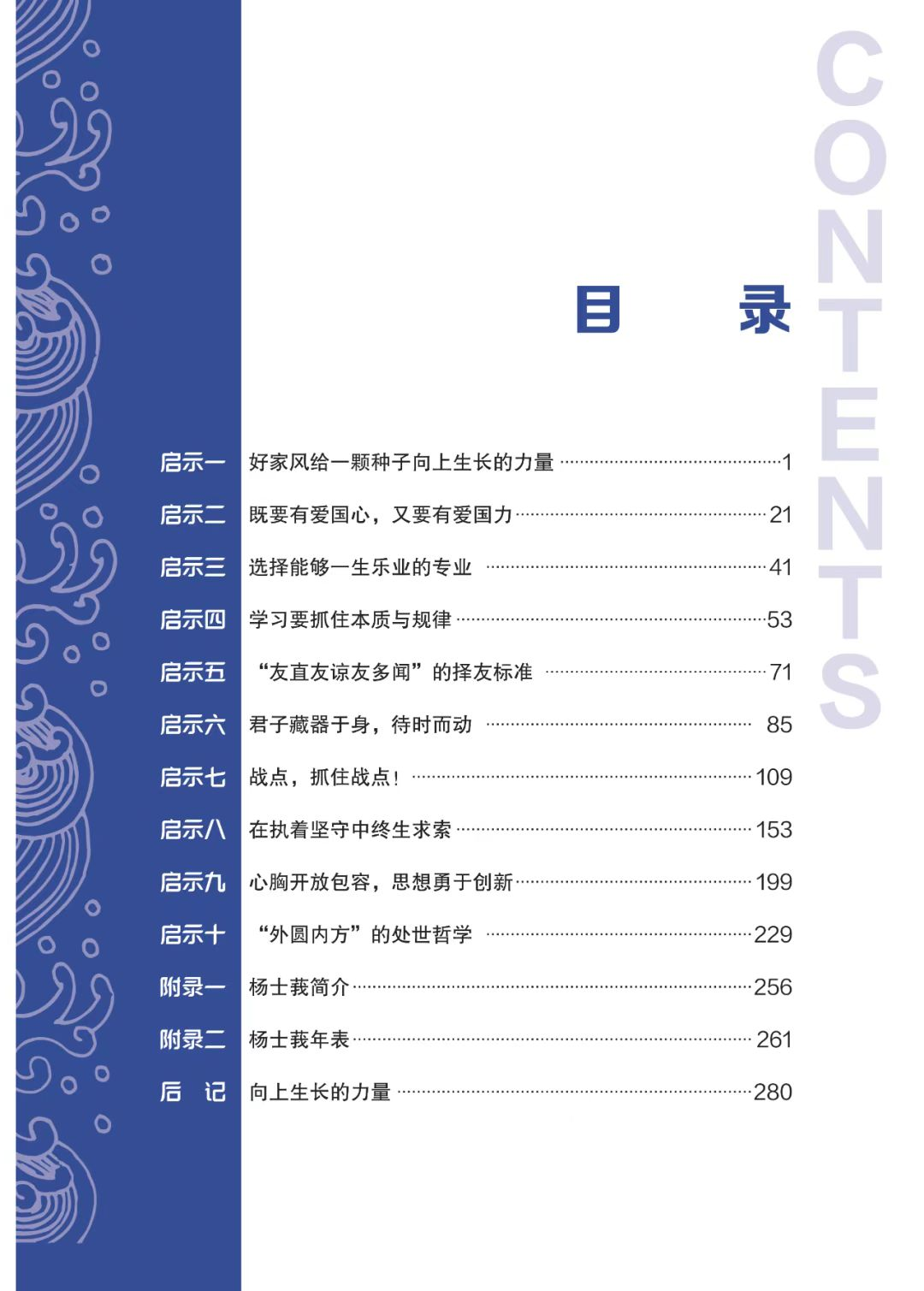 盤點策劃創意,走進啟示真諦。圖書涵蓋家風傳承、交友標准、學習規律、職業規劃及處世哲學等多個方面的啟示;圖書以立體化人生形式展現,凝練的十條啟示能夠讓人們在不同人生階段,面對不同困惑時能夠立刻擇取而閱;作者在每一章節的啟示部分都附上了個人的手記,這些手記不僅表達了對楊士莪院士經歷的共鳴,還將楊士莪院士的人生智慧和寶貴經驗轉化為易於理解的文字,使讀者能夠輕松地吸收和領悟。