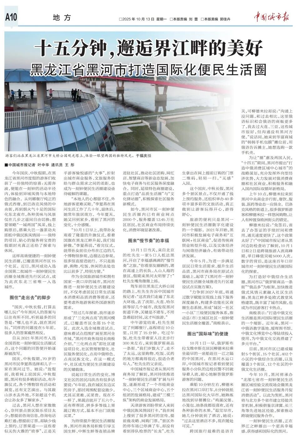10月13日,《中國城市報》刊發報道《十五分鍾,邂逅界江畔的美好黑龍江省黑河市打造國際化便民生活圈》。此篇報道聚焦黑河在城市建設中的精細化、人本化探索,展現了一座邊境城市在便民服務、開放發展中的生動實踐。讓我們共同關注,黑河如何讓『宜居』與『開放』相得益彰,讓市民與國際游客同享『圈』內便捷。