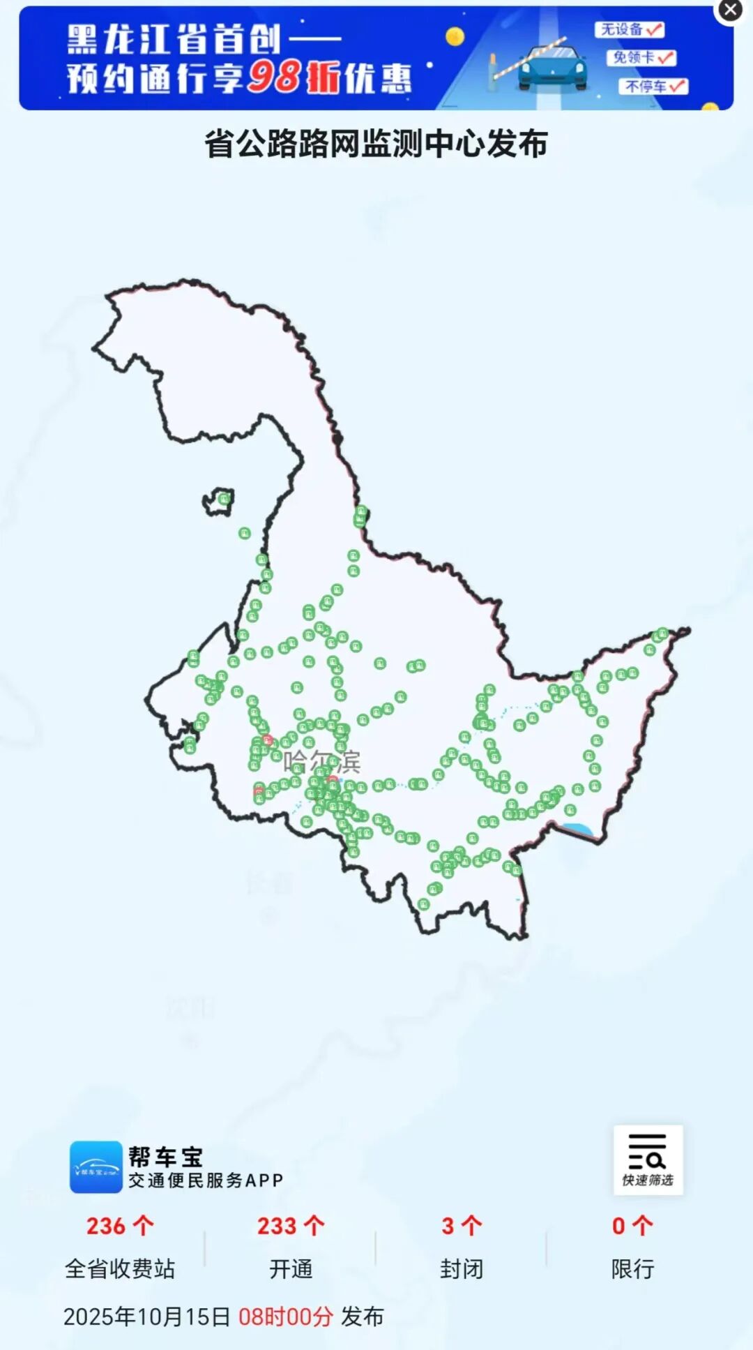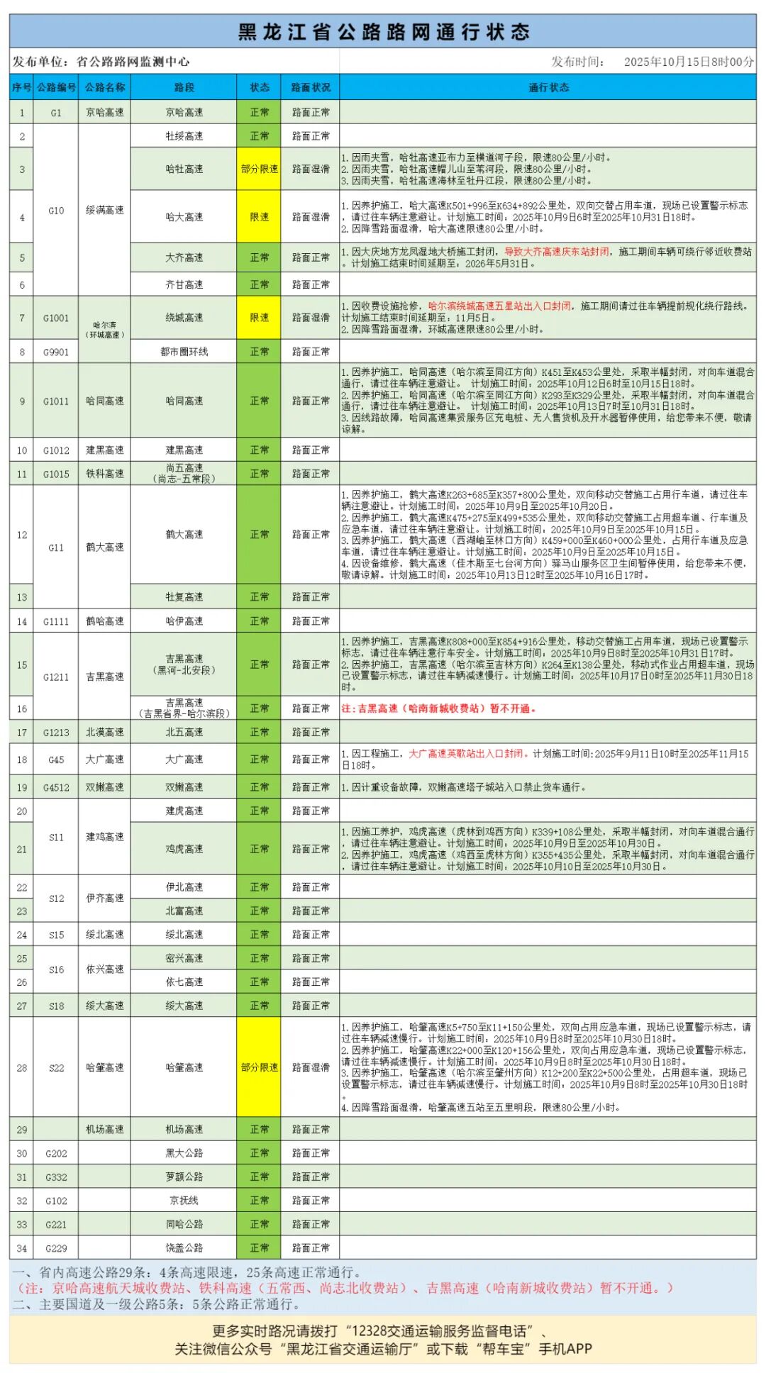 10月15日8時匯總路況信息:限速的高速有(4條高速):哈牡高速(帽兒山至牡丹江站)、哈肇高速(五站至五裡明站)、哈爾濱繞城高速、哈大高速,限速80公裡/小時。省內其它高速路況正常。