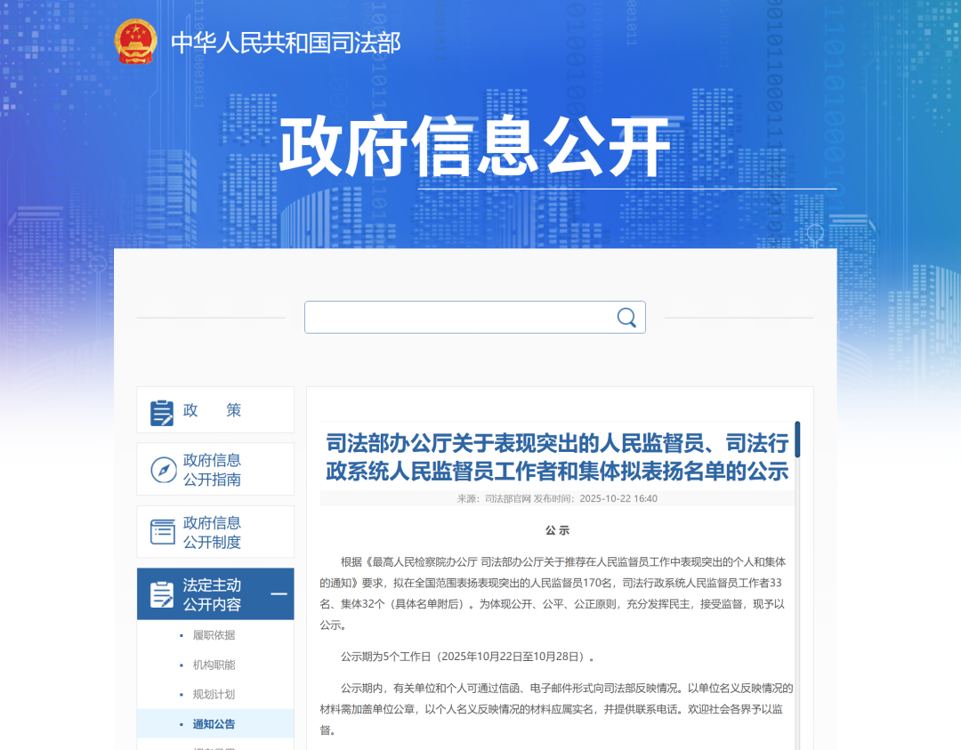 近日,司法部公示表現突出的人民監督員、司法行政系統人民監督員工作者和集體擬表揚名單,擬在全國范圍表揚表現突出的人民監督員170名,司法行政系統人民監督員工作者33名、集體32個。其中,黑龍江6人入選表現突出的人民監督員、1個集體入選司法行政系統表現突出的人民監督員工作集體、1人入選司法行政系統表現突出的人民監督員工作者。