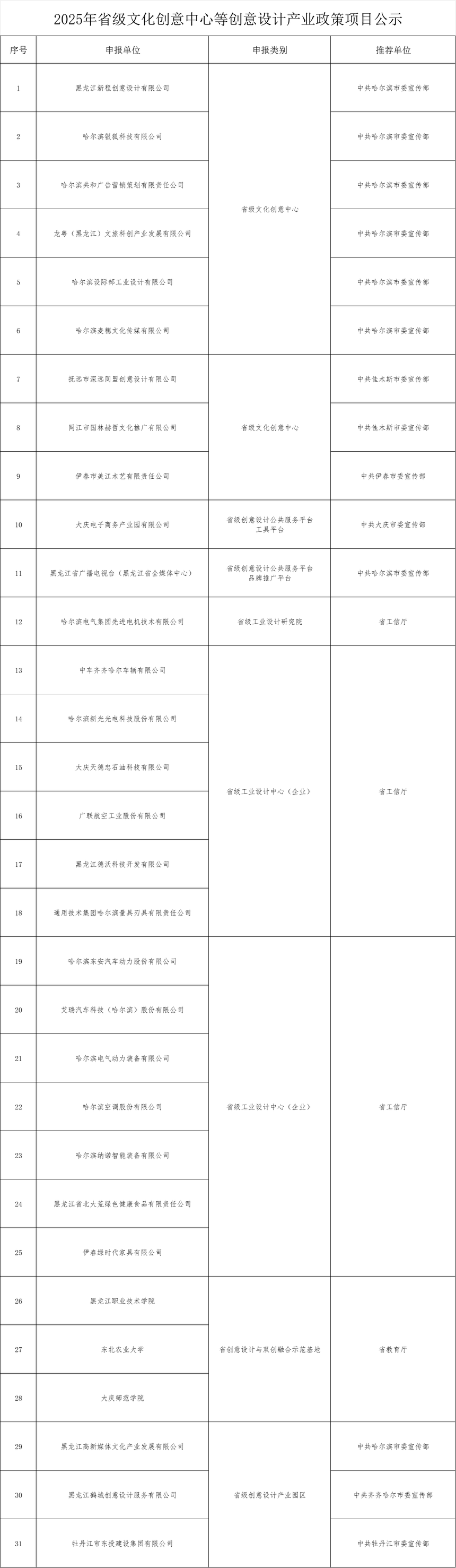 根據《黑龍江省支持創意設計產業發展若乾政策措施》 《黑龍江省創意設計產業發展專項資金管理辦法》《黑龍江省支持創意設計產業發展政策措施操作規程》要求,經申報受理、材料審核、聯合評審,現將通過評審的項目予以公示(名單詳見附件)。