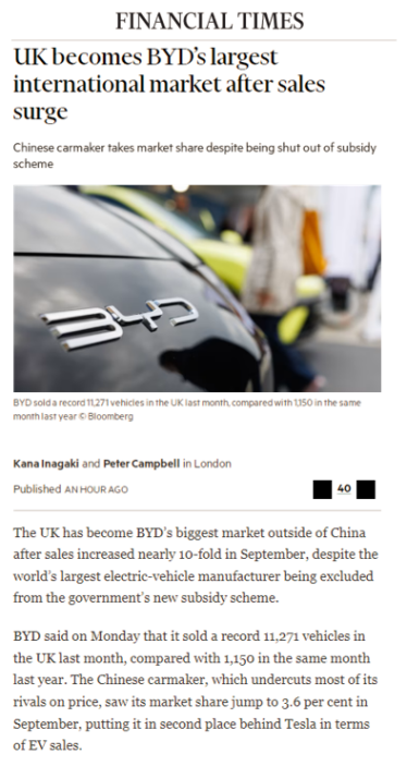 比亞迪在英國市場的高速增長,也吸引了英國主流媒體的高度關注。英國廣播公司(BBC)報道『中國電動汽車巨頭比亞迪9月英國銷量創下新高』;《泰晤士報》則以『中國新晉品牌比亞迪超越英國老牌汽車品牌』為題,指出『兩年前英國幾乎沒人聽說過比亞迪』;《金融時報》更進一步強調『英國成為比亞迪最大的國際市場』。
