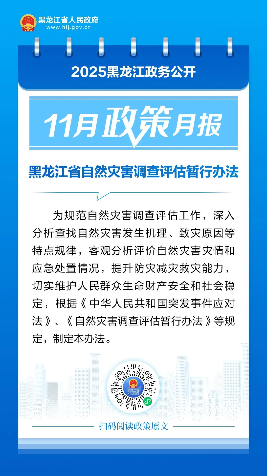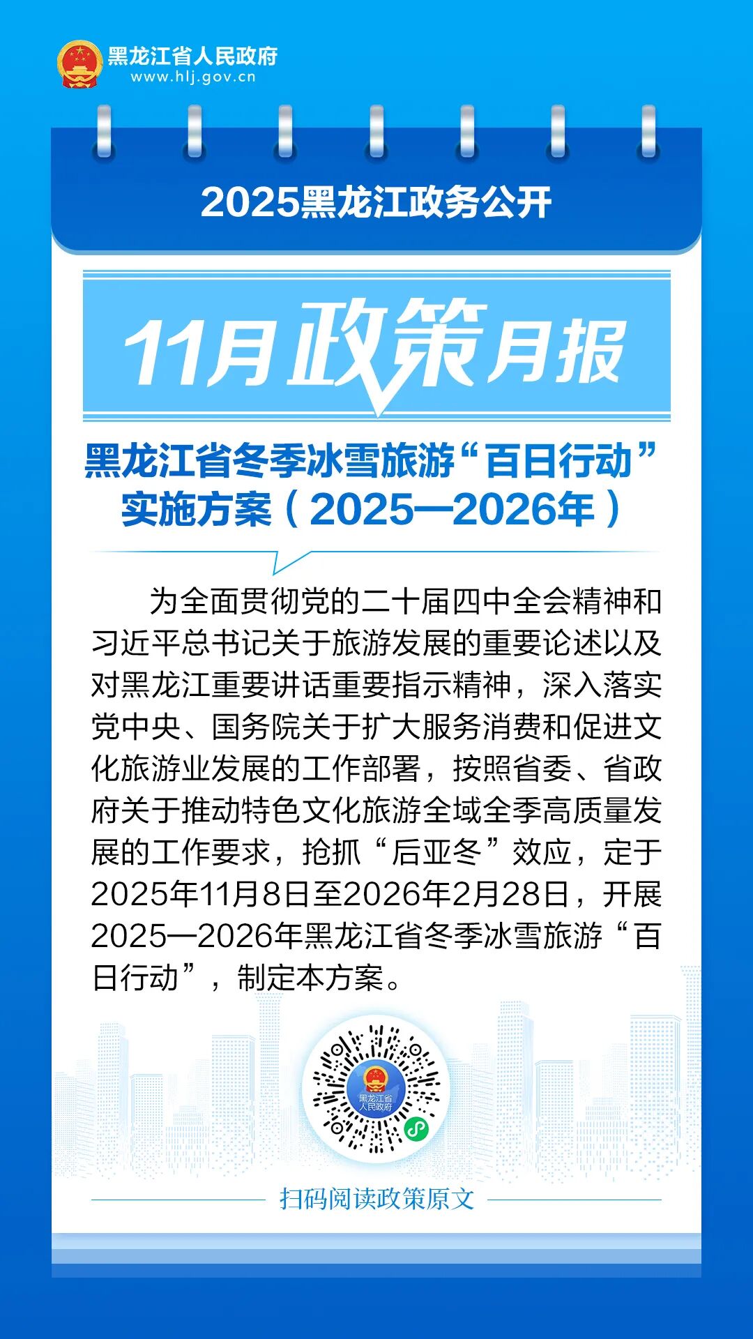 11月,關於全省最低工資標准、自然災害調查評估、冬季冰雪旅游『百日行動』等方面,黑龍江省發布多項重要政策,一起來看。