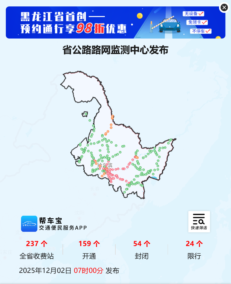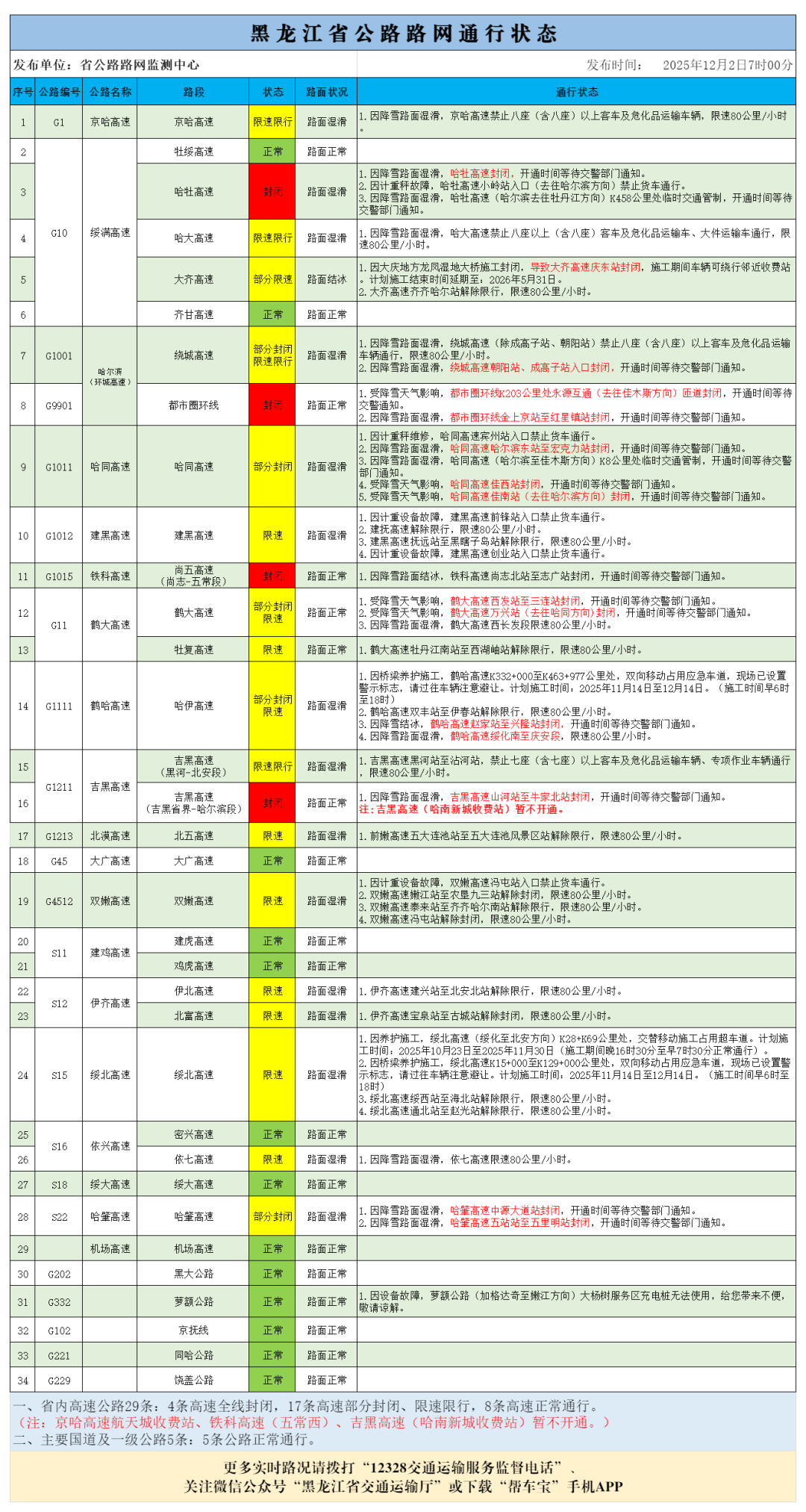 12月2日7時匯總路況信息:全線封閉的高速有(4條高速):鐵科高速、哈牡高速、都市圈環線、吉黑高速(吉黑省界-哈爾濱站)。部分封閉限速限行的高速有(17條高速):1.牡復高速、建黑高速、北漠高速、綏北高速、北富高速、雙嫩高速(齊齊哈爾南至泰來站、馮屯站至嫩江站)、大齊高速(齊齊哈爾站)、齊甘高速、鶴哈高速(雙豐站至伊春站)、伊北高速、依七高速、鶴大高速(西長發段),限速80公裡/小時。2.吉黑高速(黑河-北安段),禁止七座(含七座)以上客車及危化品運輸車輛、專項作業車輛通行,限速80公裡/小時。3.京哈高速、哈爾濱繞城高速(除成高子站、朝陽站),禁止八座(含八座)以上客車及危化品運輸車輛通行,限速80公裡/小時。4.鶴大高速(西發站至三連站、萬興站去往哈同方向)、繞城高速(朝陽站、成高子站入口)、哈同高速(佳西站、佳南站去往哈爾濱方向)、哈肇高速(中源大道站至五裡明站)、鶴哈高速(趙家站至慶安站),封閉。5.哈大高速,禁止八座以上(含八座)客車及危化品運輸車、大件運輸車通行,限速80公裡/小時。省內其它高速路況正常。