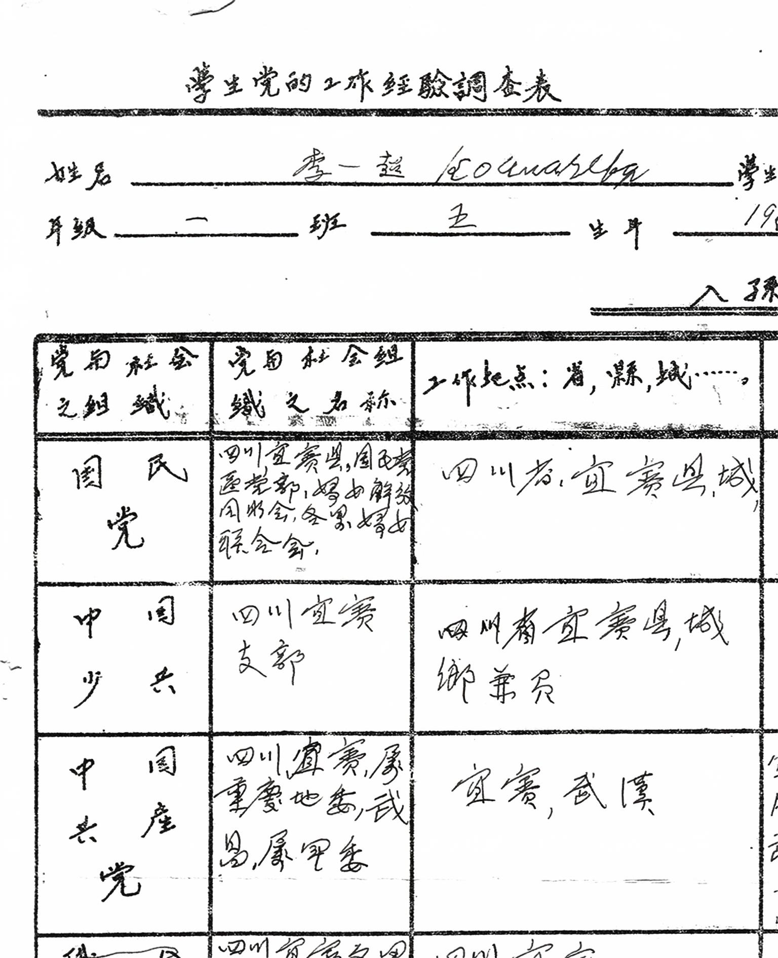 趙一曼在莫斯科中山大學留學期間填寫的調查表