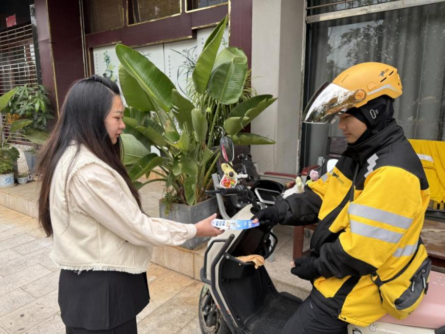 在昆明,光大銀行聯合洛龍湖社區共建『騎手金融知識驛站』,同時招募30餘名騎手成為我行『陽光消保大使』,將金融風險提示貼紙和折頁隨餐送到市民手中。騎手王師傅表示:『送餐路上多一句提醒,就能少一個人被騙,這份「愛心訂單」我們送得自豪!』