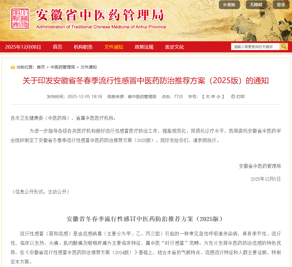 冬春季是流感高發期,伴隨流感而來的咳嗽、咳痰等癥狀,給患者帶來諸多困擾。為充分發揮中醫藥防治流感的特色優勢,結合安徽省氣候特點、流感流行特征及人群主要證候,安徽省衛生健康委員會近日發布《安徽省冬春季流行性感冒中醫藥防治推薦方案(2025版)》(以下簡稱《方案》),專利創新中藥連花清咳片憑借確切療效入選推薦名單,為科學應對流感相關咳嗽癥狀提供權威用藥指引。