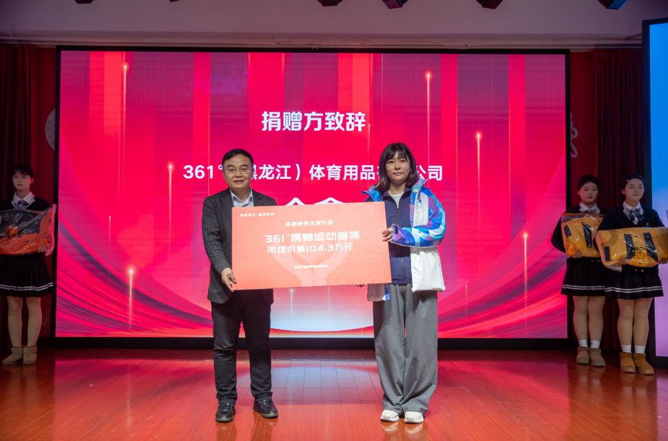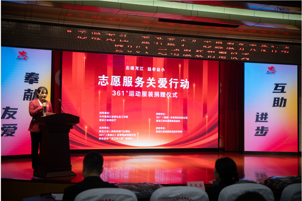 12月23日,『志暖龍江益老益小』志願服務關愛行動暨361°運動服裝捐贈儀式在黑龍江省民政職業技術學校舉行,361°體育用品有限公司將市場價值40餘萬元的運動服裝捐贈給學校的受助學子們。黑龍江省委社會工作部副部長孫鏑飛、黑龍江省民政廳副廳長姜海濤,省委社會工作部相關處室、省民政職業技術學校有關負責同志以及361°(黑龍江)體育用品有限公司、黑龍江省志願服務基金會代表出席捐贈儀式。