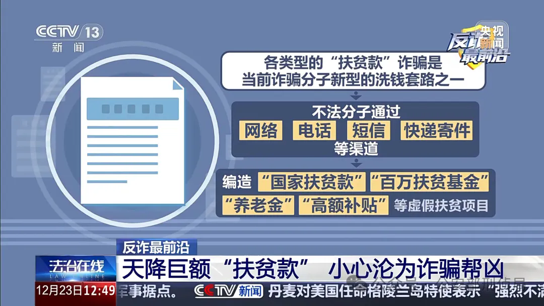 目前,各類型的『扶貧款』詐騙是當前詐騙分子新型的洗錢套路之一,不法分子通過網絡、電話、短信、快遞寄件等渠道,編造『國家扶貧款』『百萬扶貧基金』『養老金』、高額補貼等虛假扶貧項目。