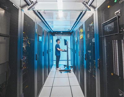廣東橫琴粵澳深度合作區內,科研人員在國家新一代類腦人工智能公共算力開放創新平臺數據中心機房內調試設備。