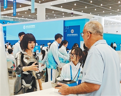 在上海合作組織天津峰會新聞中心,外國媒體記者與多模態交互型機器人『小合』對話。