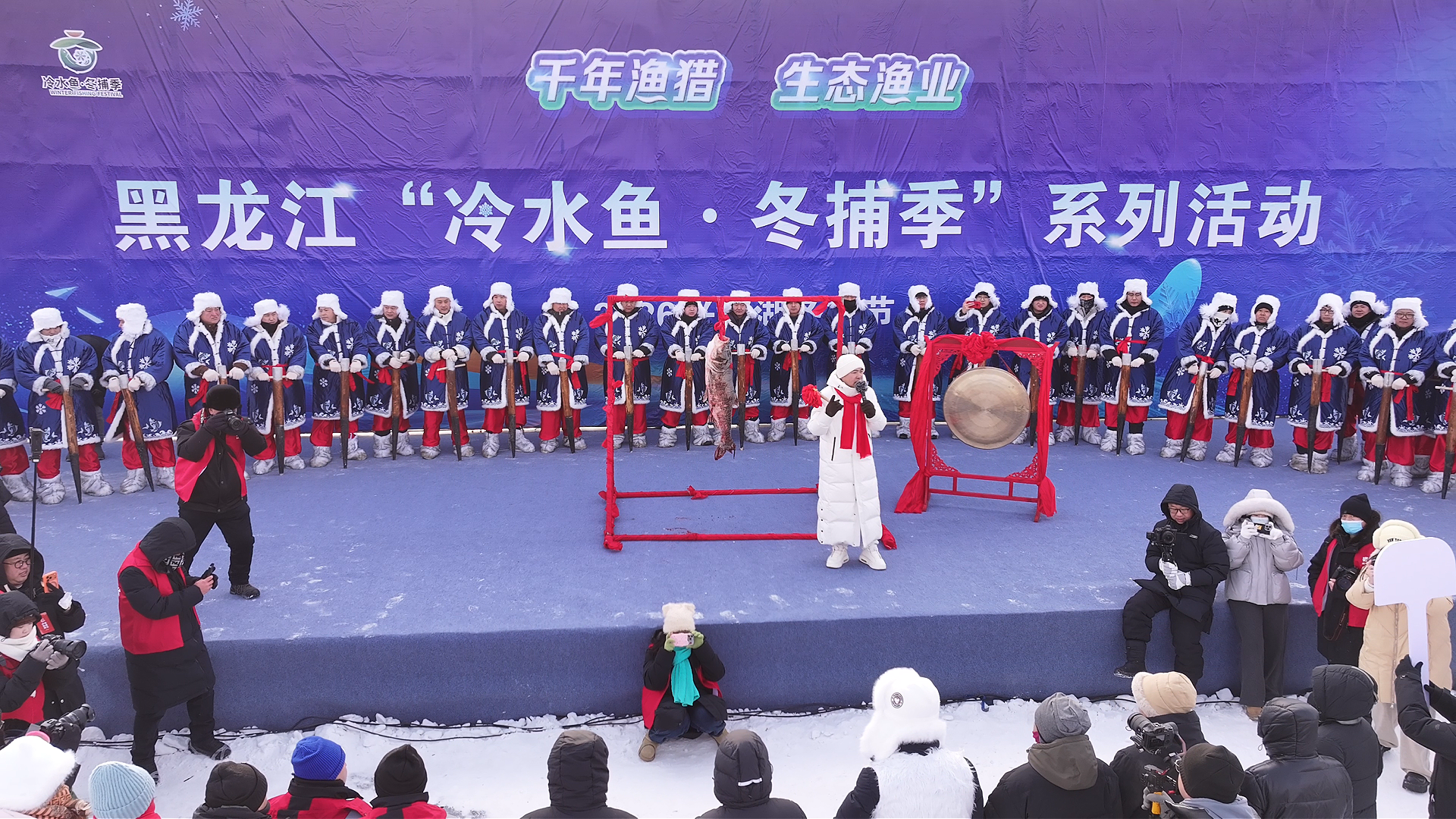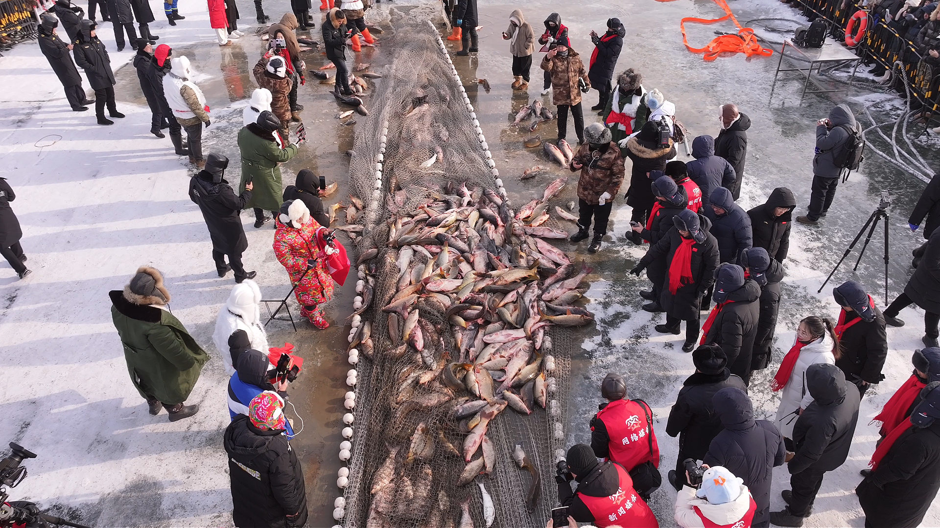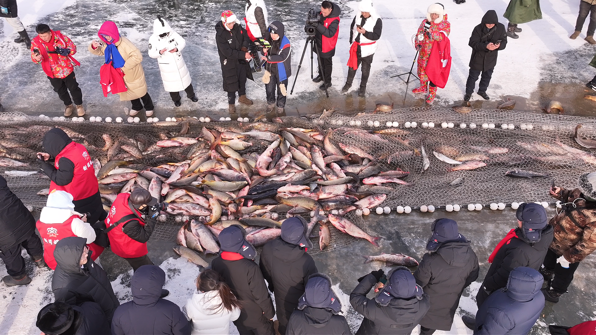 開幕式上,肅慎歌舞、薩滿祈福等非遺展演還原了肅慎先民『祭湖醒網』的古老儀式。隨著魚把頭一聲『拉網起魚嘍』,千米大網緩緩收攏,42斤重的『頭魚』破冰而出,白魚、鯉魚、胖頭魚在冰面上騰躍翻滾,引得游客歡呼連連。最終,黑龍江福成厚餐飲集團以29.9萬元競得頭魚,寓意『年年有餘』。