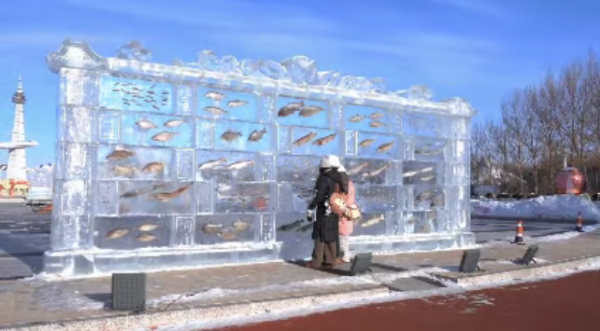 這面高3米、寬8米的魚牆,去年因游客『不認識魚』留下了小小的遺憾。今年魚牆建設期間,面對網友『能不能加上名字』的留言,當地文旅迅速響應,為江魚掛上標識、配齊『身份證』。從無聲展示到有字可循,不僅讓魚文化真正『游』到眼前,更讓人們看見一座城市願意傾聽、用心回應的溫度。也正因此,今年許多游客慕名而來,專程來看這面『會聽勸』的冰封魚牆。七臺河游客譚微說:『咱東北的冰雕,很多都是造型的雕刻,搭配五顏六色的燈光。把魚放在冰牆裡面,這個我是第一次見,所以我就特別好奇它是怎麼凍出來的,是把活魚放在裡面凍,還是放在一個模具裡,我覺得挺好奇的,所以就直接奔它來了,來一探究竟。到這之後,我說同江的魚這麼出名,必須得吃點江魚,我愛人說他中午請客。』