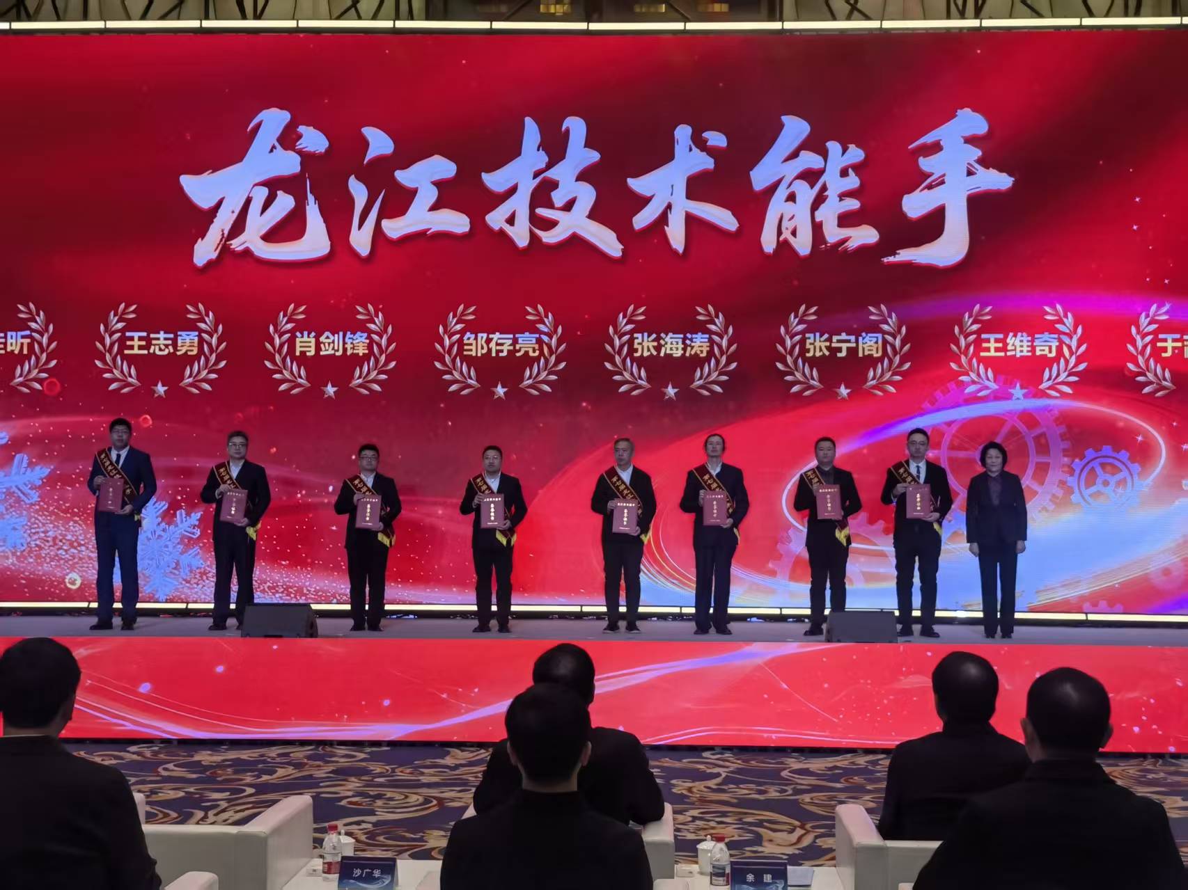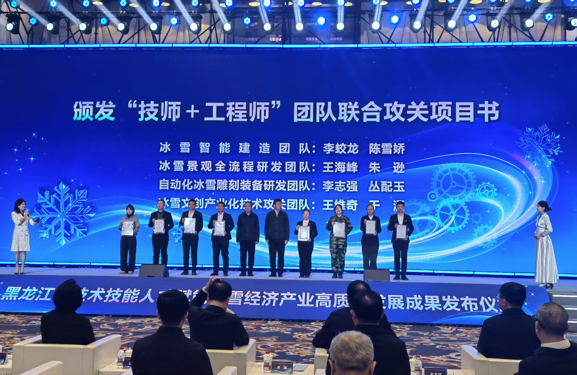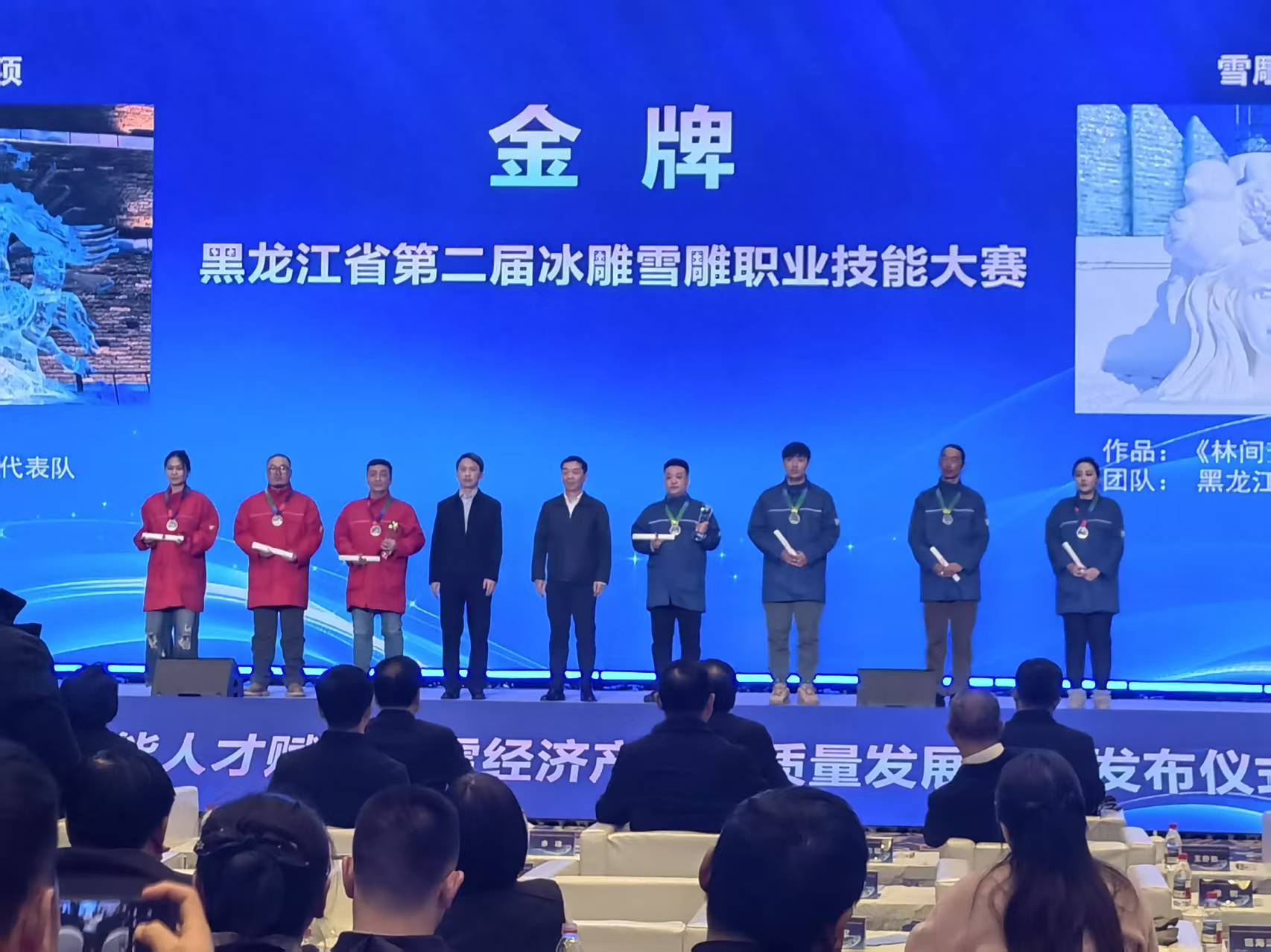 1月23日,黑龍江省技術技能人纔賦能冰雪經濟產業高質量發展成果發布儀式在哈爾濱舉行,正式啟動『冰雪振興龍江技能照亮前程』專項行動,為冰雪經濟領域5名『龍江大工匠』、8名『龍江技術能手』、5名『黑龍江省首席技師』頒發榮譽證書,並為黑龍江省第二屆冰雕雪雕職業技能大賽的獲獎人員頒獎。省直有關部門、行業企業、院校相關負責人及技能人纔代表參會。