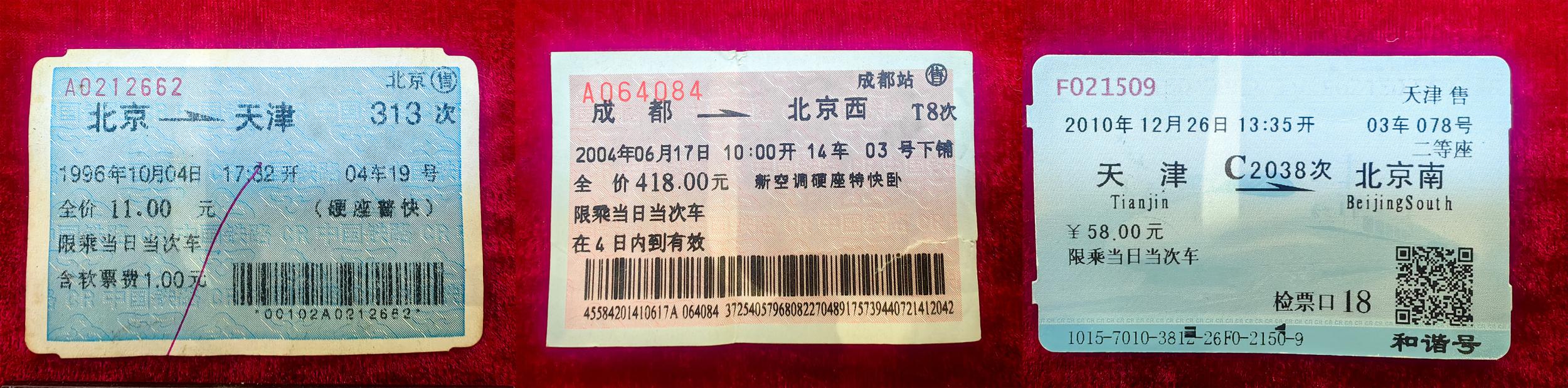 拼版照片,1996年、2004年、2010年的紙質火車票。(中國鐵路太原局集團有限公司供圖)