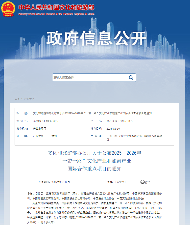 近日,文旅部網站發布《關於公布2025—2026年『一帶一路』文化產業和旅游產業國際合作重點項目的通知》,經合規性審查、評審、公示等程序,確定了該項目名單。其中,黑龍江1個項目入選。