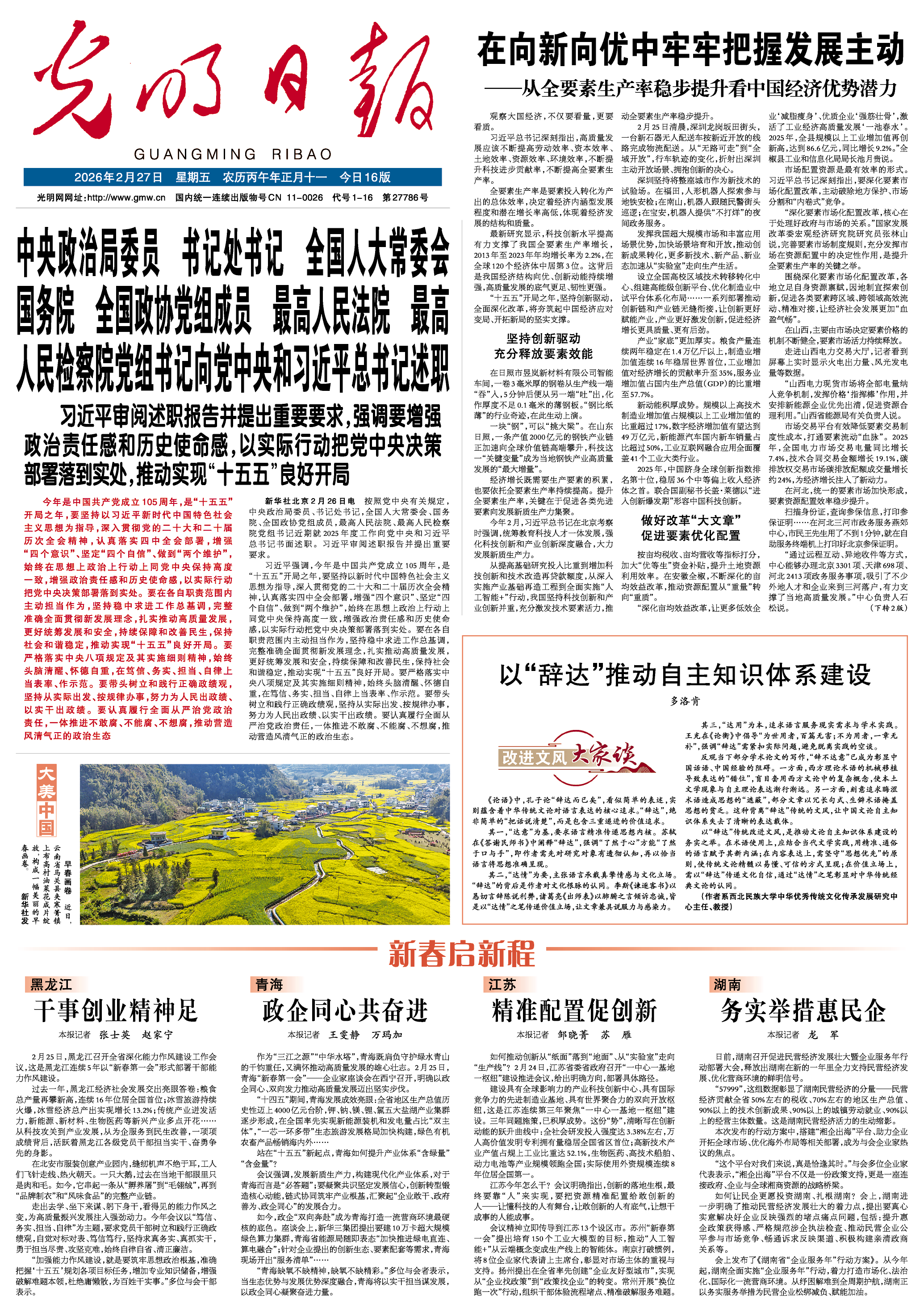 過去一年,黑龍江經濟社會發展交出亮眼答卷:糧食總產量再攀新高,連續16年位居全國首位;冰雪旅游持續火爆,冰雪經濟總產出實現增長13.2%;傳統產業迸發活力,新能源、新材料、生物醫藥等新興產業多點開花……從科技攻關到產業發展,從為企服務到民生改善,一項項成績背後,活躍著黑龍江各級黨員乾部擔當實乾、奮勇爭先的身影。