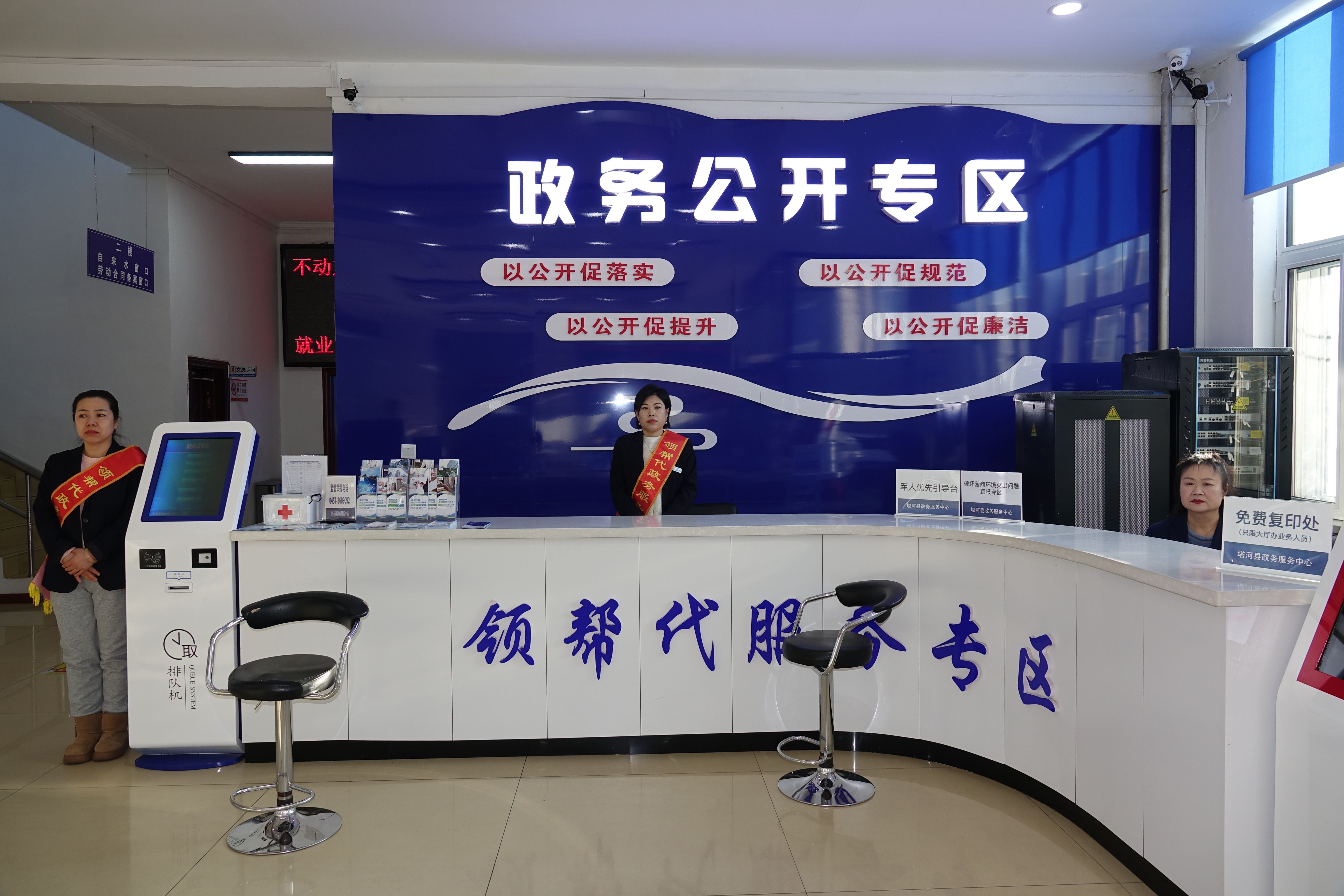 精心謀劃,築牢服務根基。塔河縣政務服務中心以標准化、規范化建設為抓手,從服務體系、流程設計、隊伍建設等多方面精心布局,確保服務工作有序高效推進。在服務體系建設上,中心合理劃分諮詢引導區、幫辦代辦區、自助辦理區等功能區域,配備排隊叫號、自助查詢、政務公開查詢機等智能化設備,同時在便民服務角放置老花鏡、放大鏡、雨傘等物資,細節之處彰顯精心考量。在隊伍建設方面,定期組織政務服務禮儀專項培訓,圍繞服務理念、溝通技巧、操作規范等內容開展集中學習,強化『五個主動』服務標准,著力打造一支專業、高效、暖心的服務隊伍。