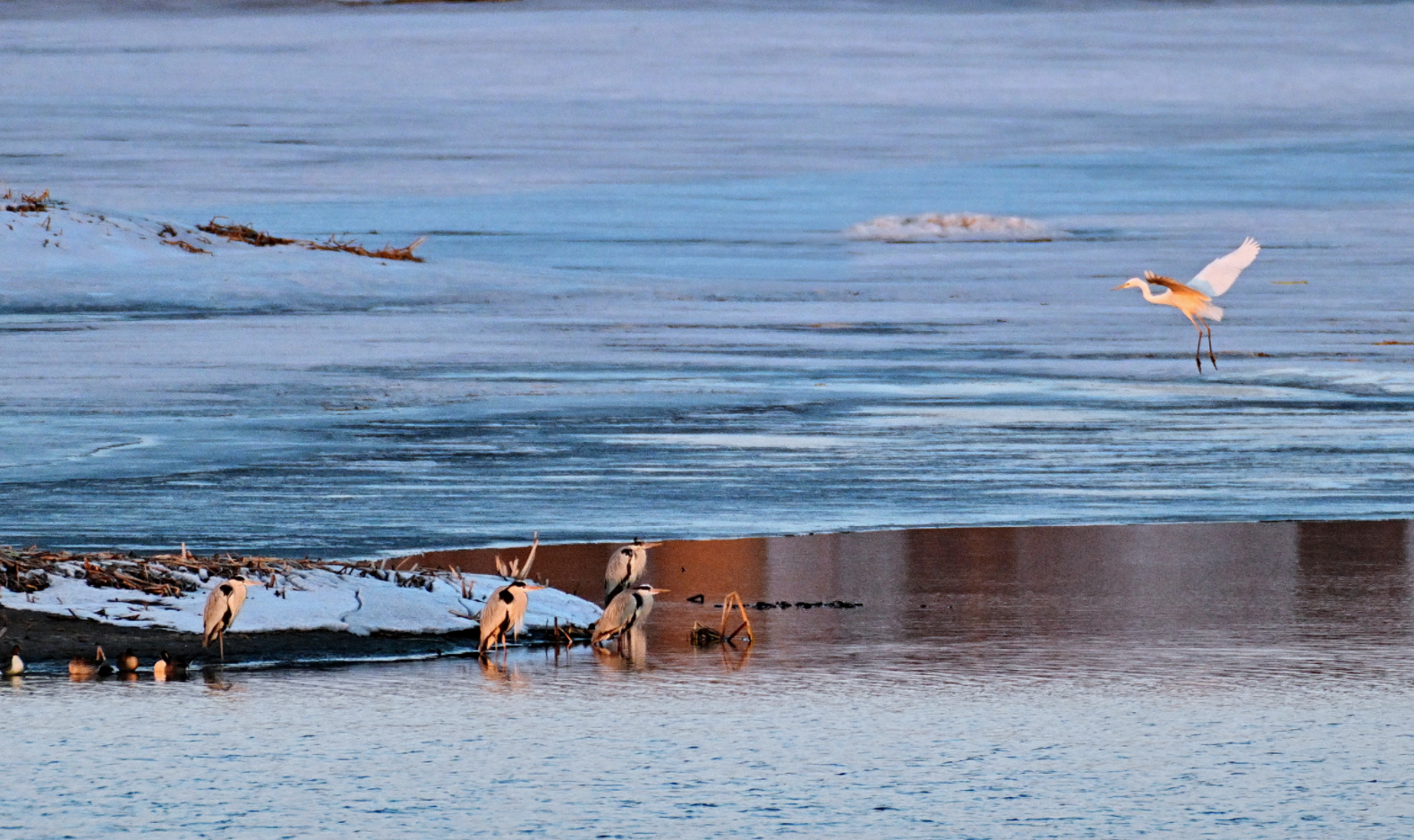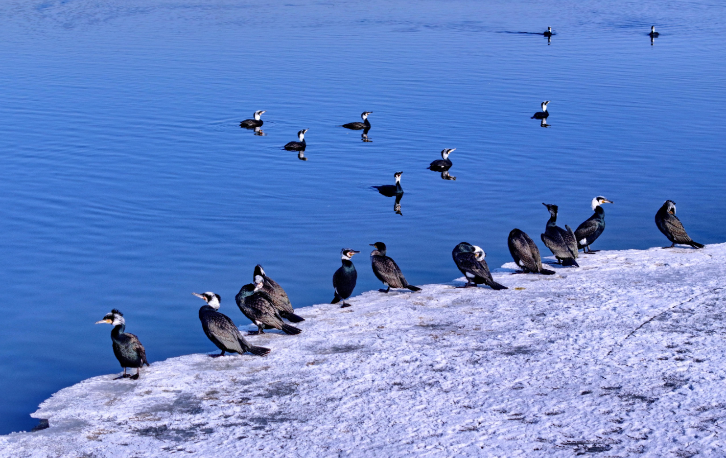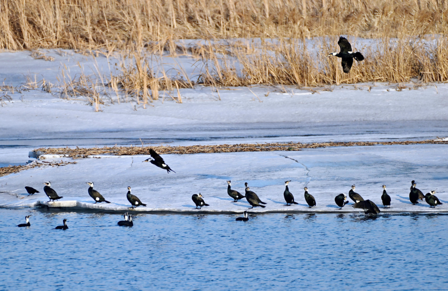 白臉鸕?的黑羽在陽光下泛著光澤,或駐足冰面休整,或潛入水中覓食,留下圈圈漣漪;蒼鷺亭亭立於淺灘雪地中,舒展修長羽翼,盡顯優雅身姿;綠頭鴨、赤麻鴨和針尾鴨等穿梭於初融的水域間,振翅追逐,嬉戲打鬧,清脆啼鳴此起彼伏,盡享春日暖陽。