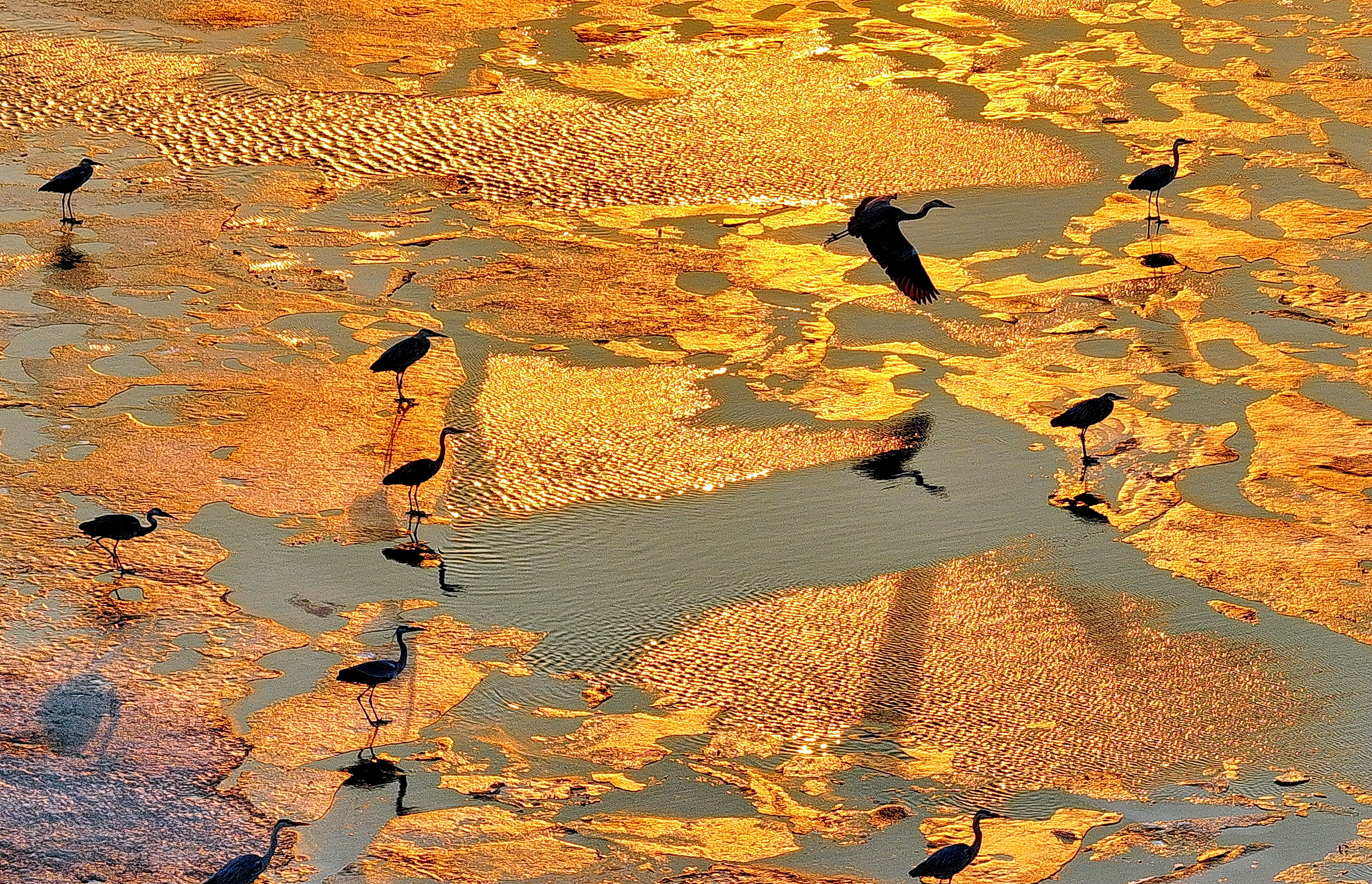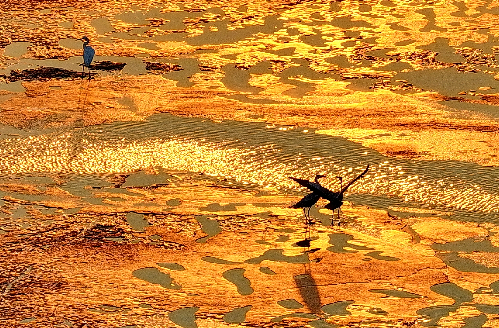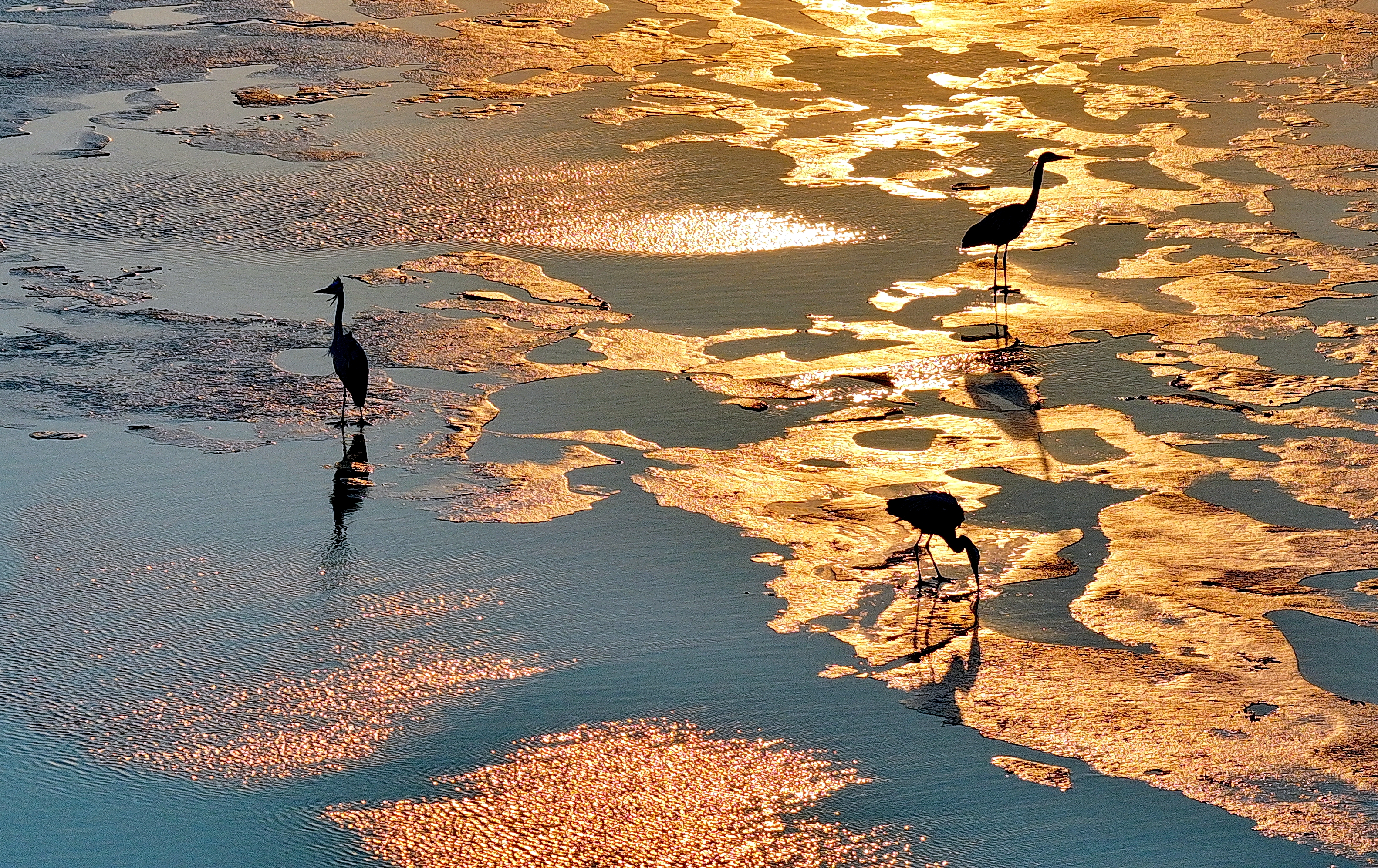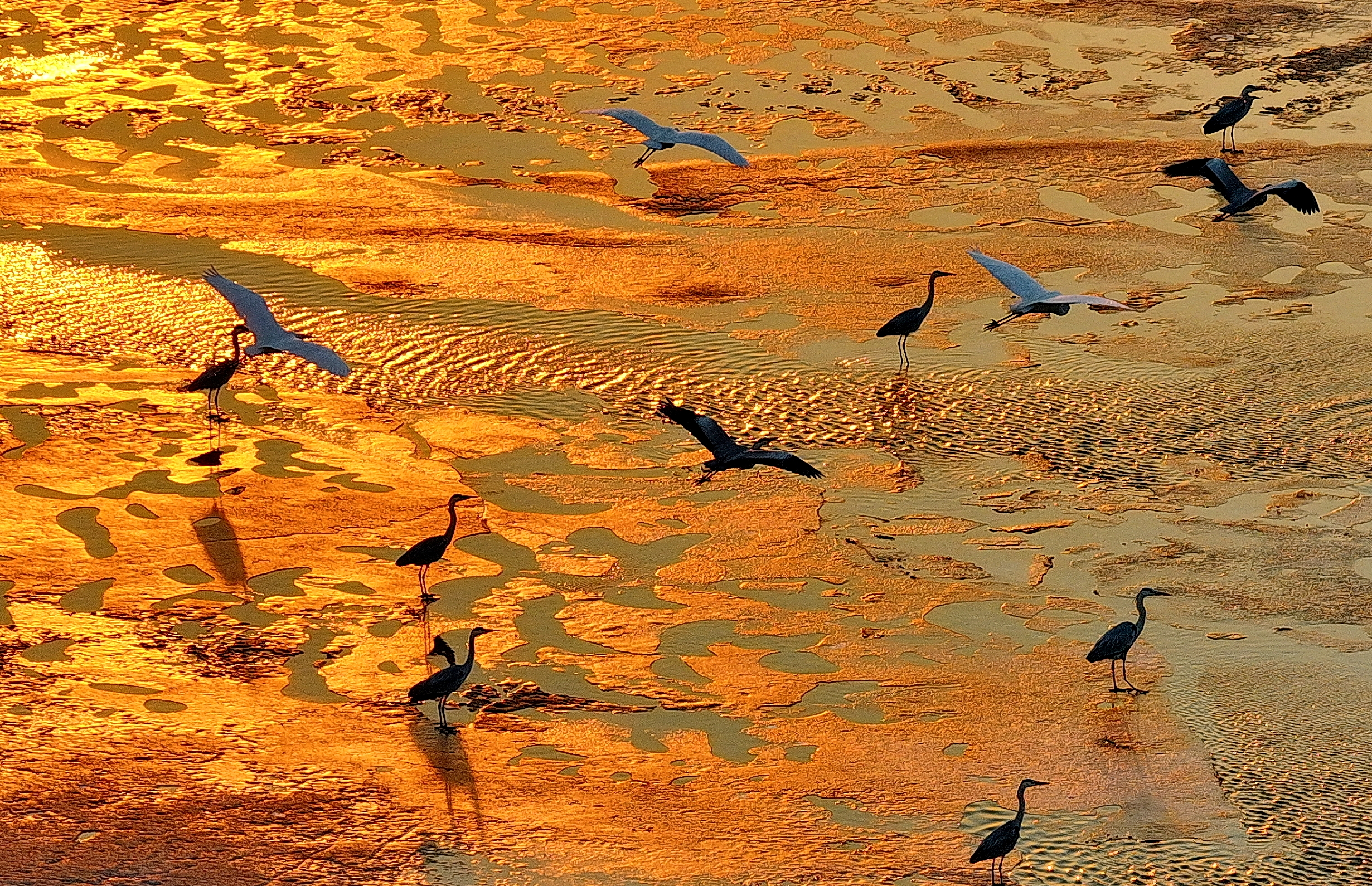 在這片金色的灘涂上,成群候鳥棲息游弋,成為畫卷中最靈動的點綴。蒼鷺舒展著修長的身姿,或靜立淺灘凝視水面,靜待魚蝦浮現;或振翅低飛,羽翼掠過金色波光,漾開圈圈漣漪。高傲的東方白鸛在冰面上悠然地踱步,盡顯鳥中王者氣度。愛吵鬧的鸕?和江鷗等水鳥成群結伴,上下翩飛,打鬧嬉戲,清脆的鳴叫聲伴著江水輕響,在暮色中回蕩。
