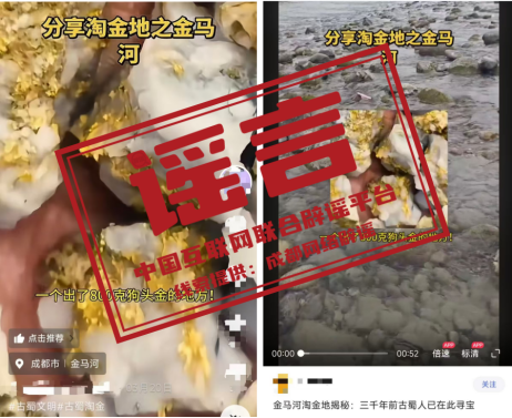 詳情:近期,不少自媒體在網絡平臺分享『都江堰金馬河是淘金地』,稱該點位是『一個出了800克狗頭金的地方!』對此,4月4日,都江堰市水務局發布情況通報稱,經聯合調查組核實,相關視頻系李某某為博取關注,吸引流量,促進店鋪旅游產品銷售,從AI平臺搜索『淘金』『狗頭金』等內容,拼接剪輯在抖音平臺發布,視頻內容嚴重誤導公眾。經法治宣傳教育,視頻發布者已主動刪除相關視頻。(來源:『成都網絡闢謠』微信公眾號)