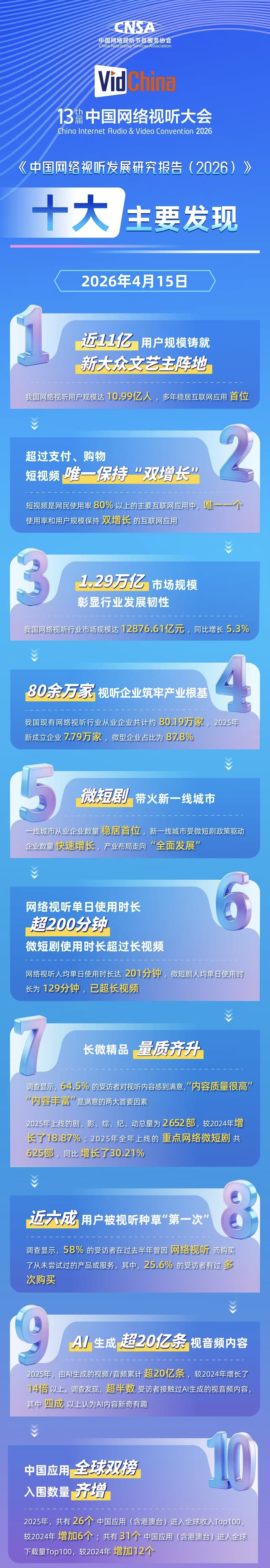 4月15日,第13屆中國網絡視聽大會在四川成都開幕,大會發布《中國網絡視聽發展研究報告(2026)》顯示,截至2025年12月,我國網絡視聽用戶規模達10.99億人,同比淨增776萬人,保持穩步增態勢,彰顯了業極強的發展韌性與對用戶的強勁吸引力。在全網互聯網應用供給持續豐富,用戶注意力競爭趨激烈的環境下,網絡視聽作為多年穩居首位的互聯網應用,已是國內滲透范圍最廣,覆蓋人數最多,鏈接千行百業和萬億大眾的數字服務載體。