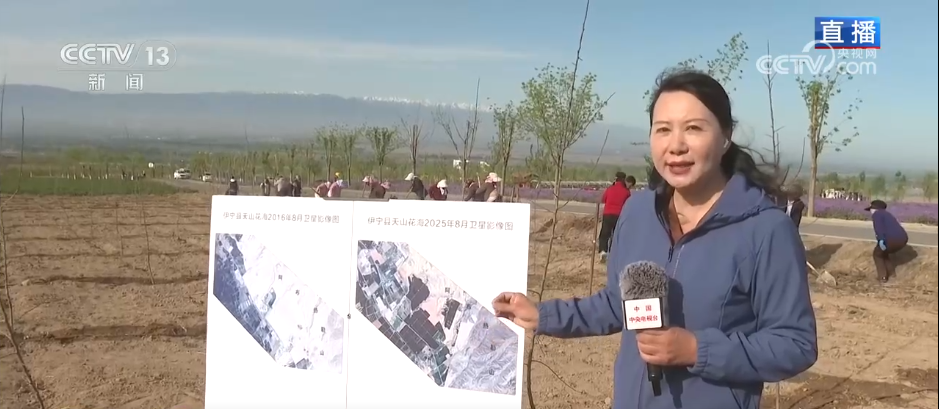 2016年8月拍攝的衛星影像圖與2025年8月拍攝的影像圖對比後,明顯看出綠色增加了、綠地更多了,植被覆蓋率從23%提昇到72%,區域降雨量增加了4到8毫米。現在已經種了2萬多畝糧油作物、1.8萬畝特色林果、2.2萬畝觀景花卉和世界上單體連片面積最大的薰衣草花田,以往寸草不生的荒蕪之地如今變成了生機盎然的天山花海。