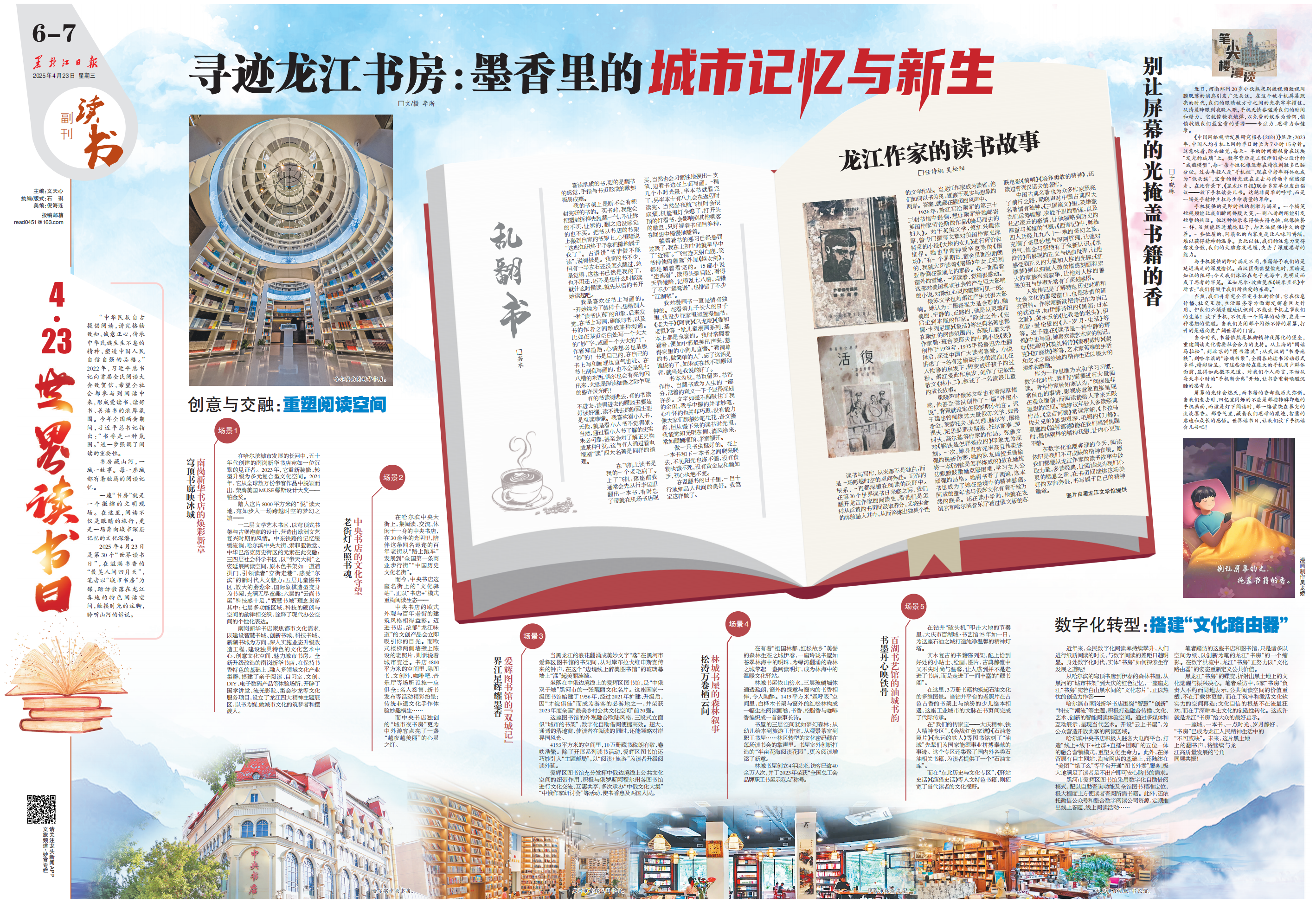 《尋跡龍江書房:墨香裡的城市記憶與新生》副刊作品,生動描寫了龍江閱讀空間的蝶變,激發了群眾走進書房、熱愛閱讀的熱情,進一步推動形成全民閱讀的良好氛圍,展現了黑龍江深厚的文化底蘊與文化振興的堅實步伐。在第30個世界讀書日前夕,作者奔波2000餘公裡,以『龍江書房』為切入口,分別踏訪分散在哈爾濱、黑河、伊春、大慶等地具有不同代表性的5處特色閱讀空間,深度解讀其文化內涵與創新實踐。作品以場景化敘事,將閱讀空間與城市記憶、地域特色、文化傳承相結合,以鮮活的文學筆觸講活了黑土地的全民閱讀故事,既勾勒出了『書香中國』在黑龍江的生動圖景,又挖掘了閱讀空間背後的文化密碼,更以閱讀之美賦能文旅融合,彰顯了黑土地上的文化覺醒與振興決心,兼具新聞價值、文化價值與社會意義。該作品立意新穎獨特,意義深遠,引發廣泛社會關注,龍頭新聞、黑龍江新聞網、新浪網、搜狐網、網易新聞等14家主流新媒體和新聞門戶網站進行了轉載,覆蓋全網多元傳播渠道。截至報送之日,作品總閱讀量(瀏覽量、點擊率)達919077次,有效擴大了全民閱讀工作的影響力。 |