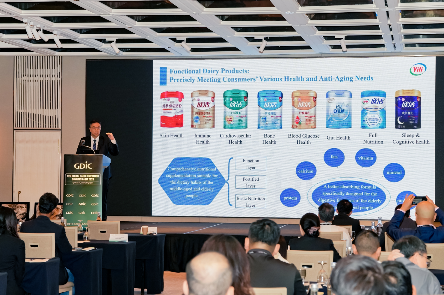 在4月22日舉行的大會主論壇上,司徒文佑博士以《基於人群營養的乳品創新及其在健康老齡化中的應用》為題發表演講,系統闡釋適老乳制品開發的科學路徑。他指出,伊利圍繞老齡化社會的核心需求,構建了覆蓋基礎營養補給、精准營養強化與場景化功能補充的三大產品體系,打造了個性化適老乳制品矩陣,精准回應了中老年群體的多元健康需求。