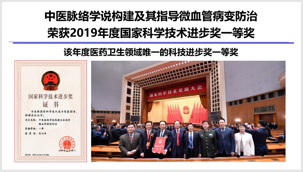 由此,建立了中國中西醫結合學會血管-脈絡病專業委員會,並連續召開了12屆中國中西醫結合血管病學大會。『中醫脈絡學說構建及其指導微血管病變防治』榮獲2019年度醫藥衛生領域唯一一項國家科技進步一等獎,列入新時代中醫藥標志性科技成果(2012-2022),名列第一大類別『中醫藥新學說新學科形成』首位。