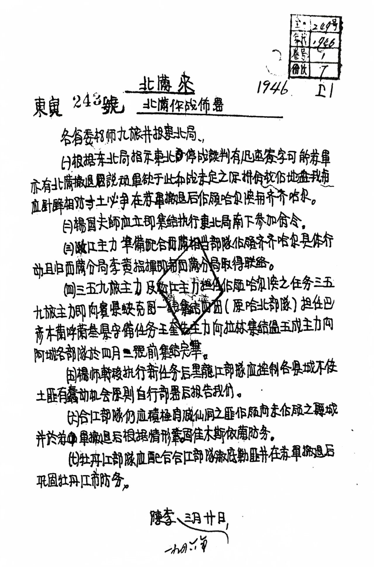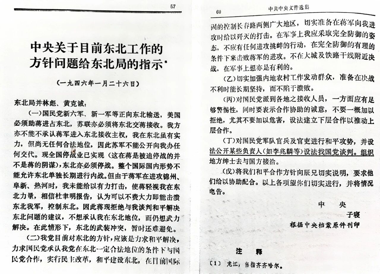 1946年1月26日,劉少奇為中央起草的關於指示李兆麟負責同國民黨談判工作的部分電報文照
