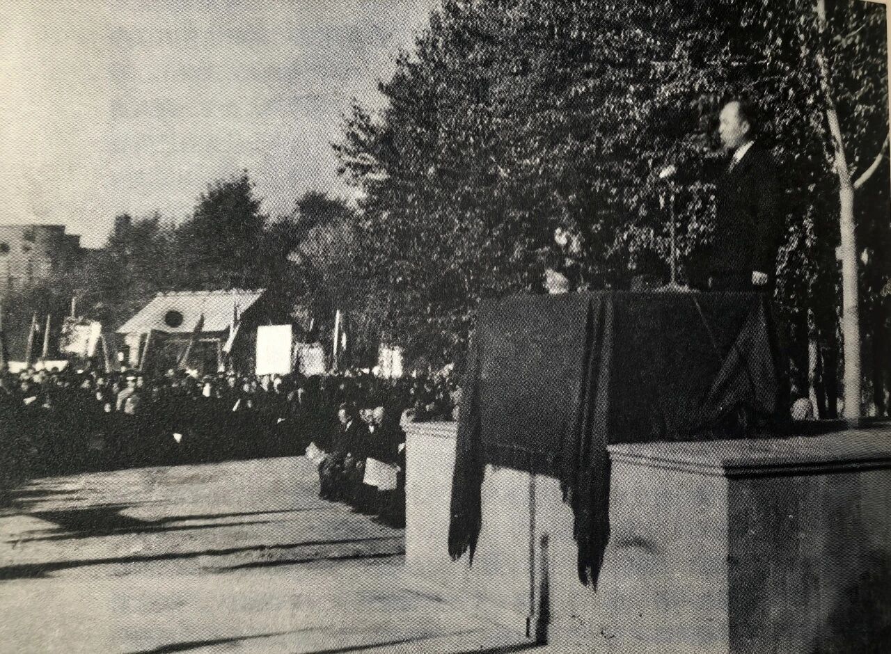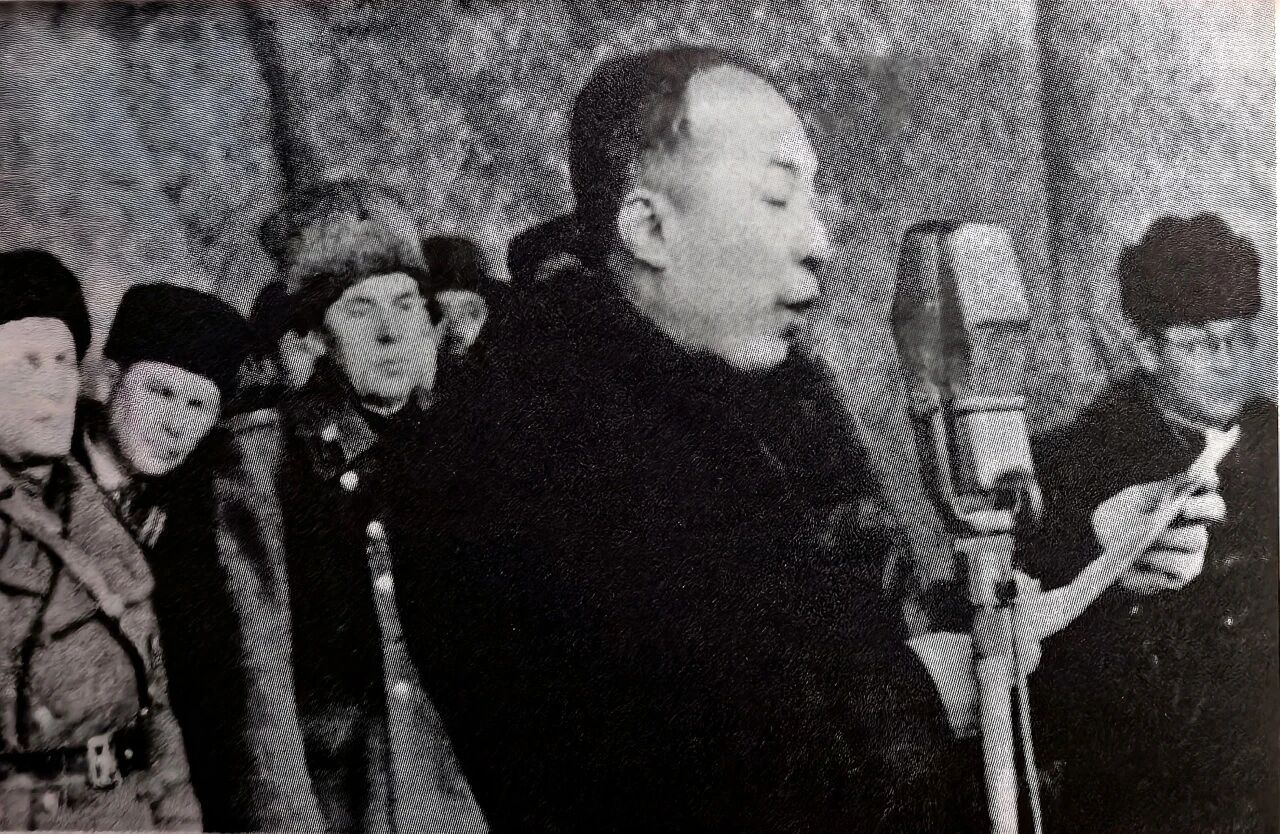 1945年抗戰勝利後,李兆麟在哈爾濱八區廣場群眾大會上演說