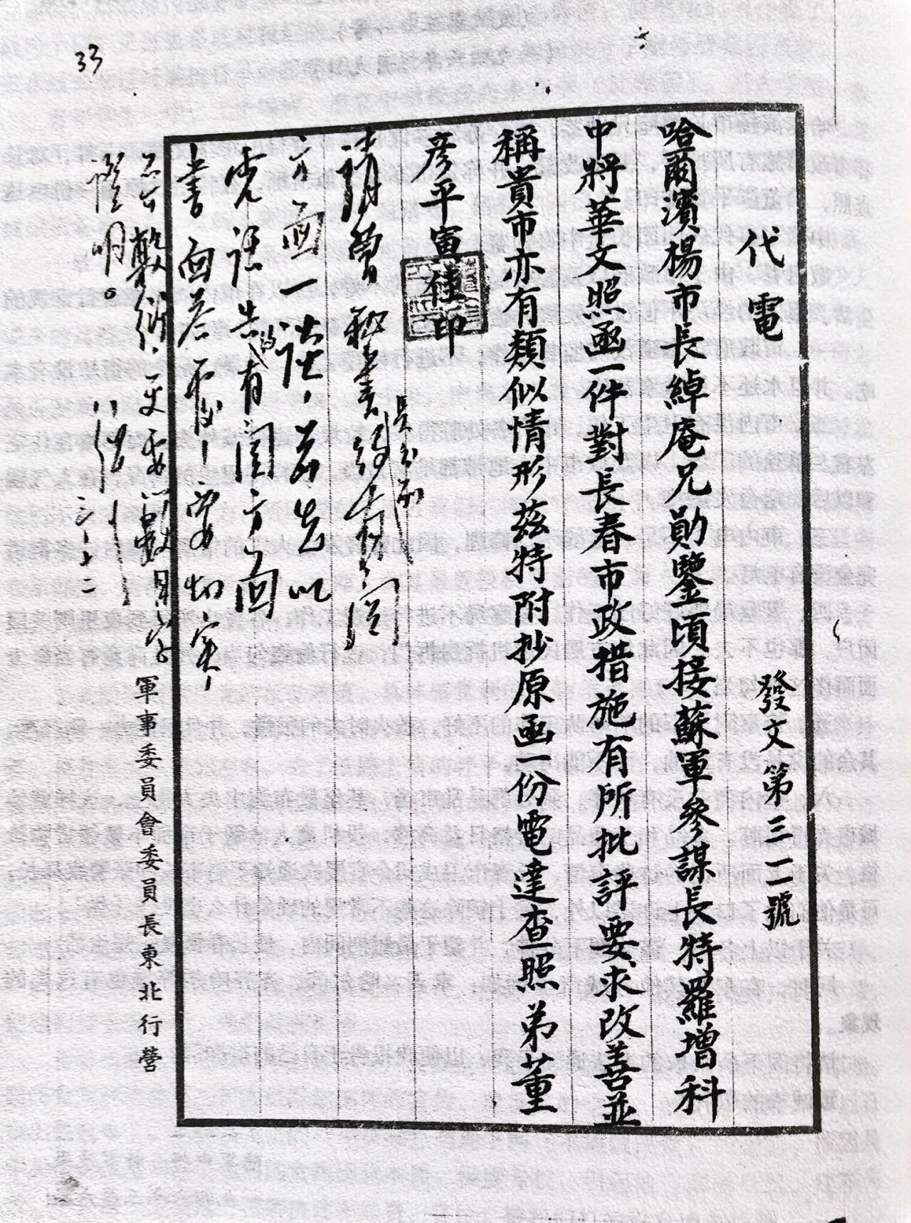 國民黨長春市市長董彥平給國民黨哈爾濱市市長楊綽庵的代電