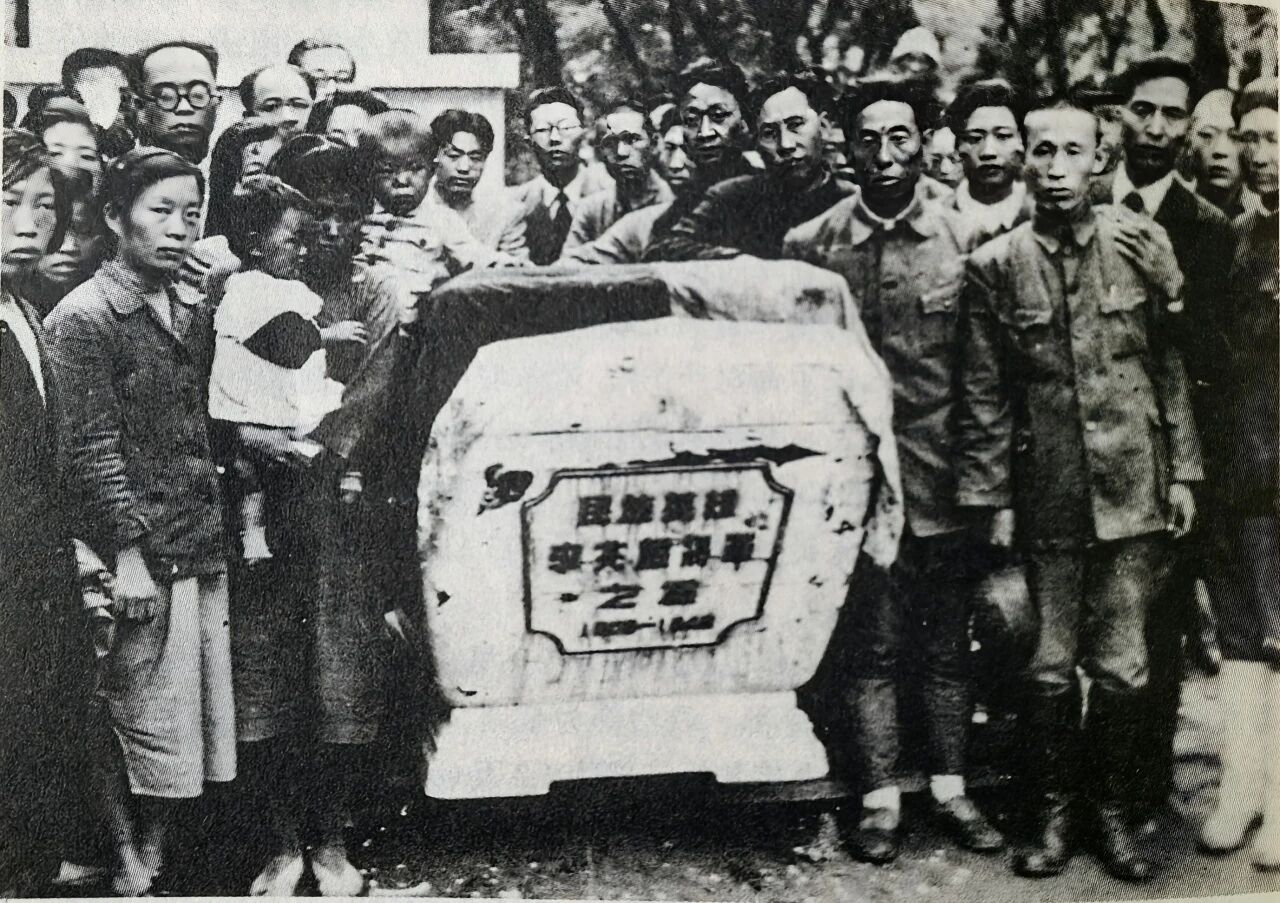 1946年8月12日,東北抗聯老戰友在李兆麟安葬儀式上。前排抱孩子者為金佰文,左後戴眼鏡者為馮仲雲,右二至右四依次為王明貴、於天放、李延祿